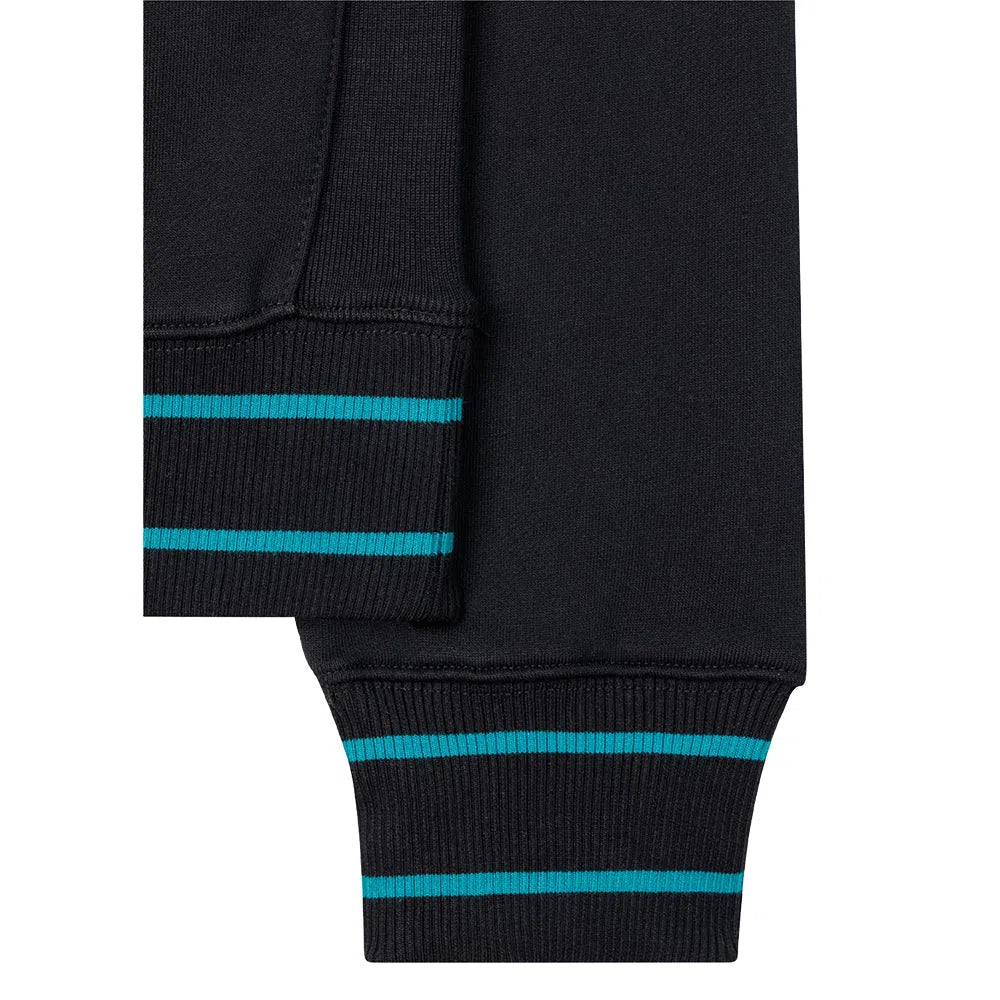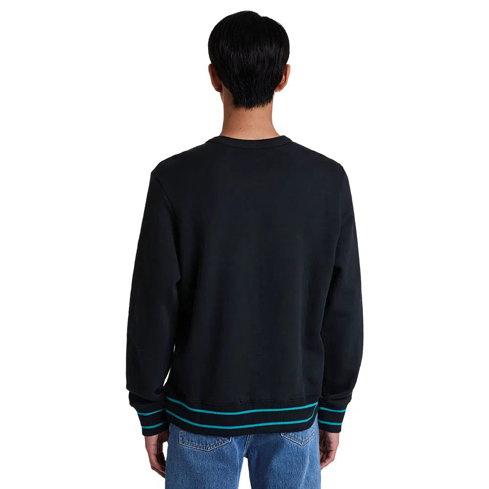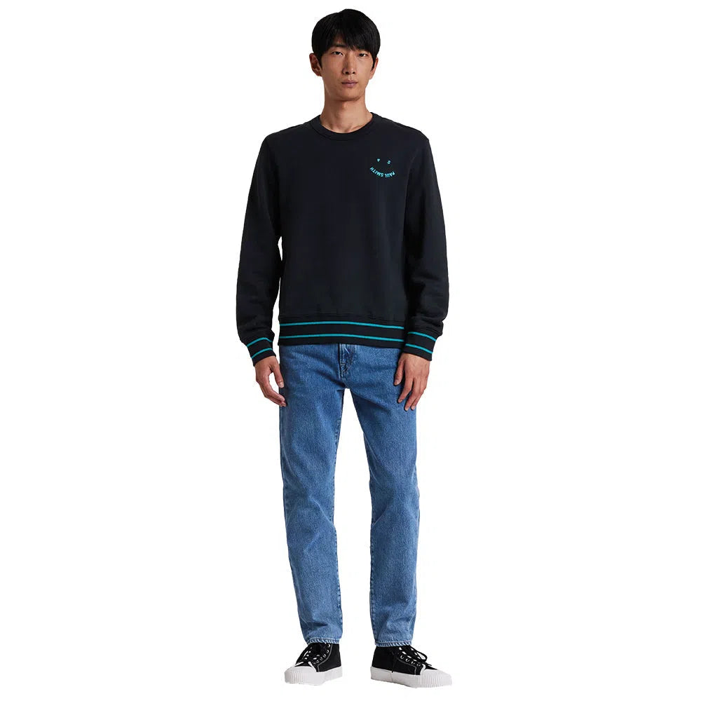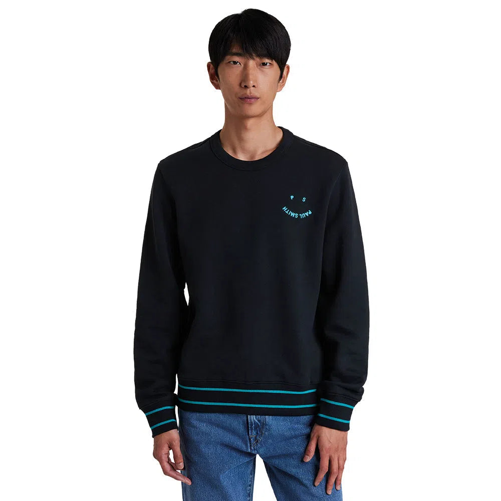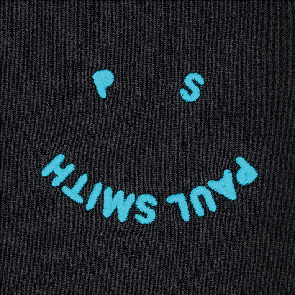 Dieses PAUL SMITH Happy Logo Sweatshirt - Black ist aus biologisch angebauter Baumwolle geschnitten und mit unserem 'Happy'-Logo auf der Brust bestickt. Dieses Sweatshirt mit normaler Passform ist mit türkisfarbenen Doppelstreifen an den Bündchen und am Bund versehen.