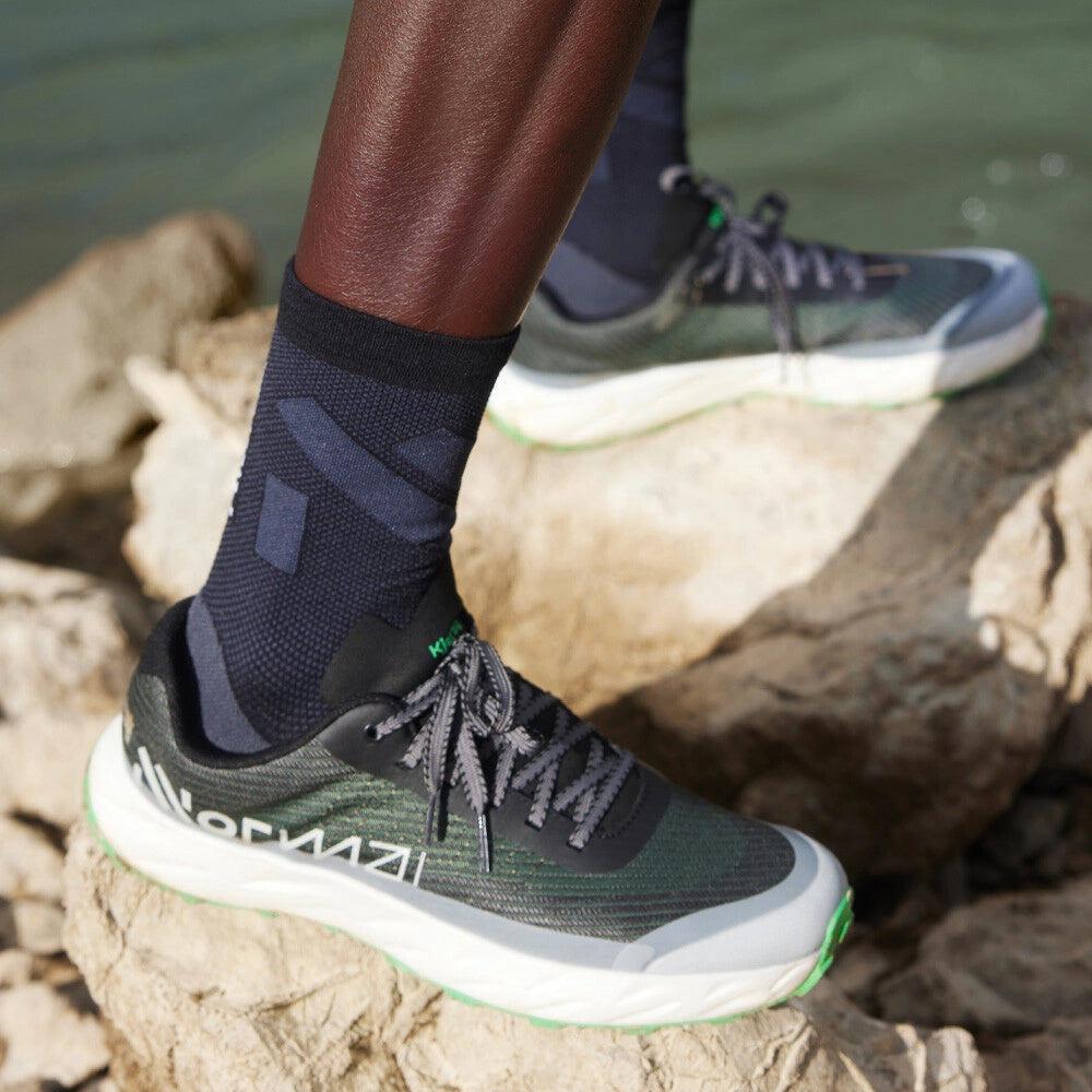 Les chaussures NNORMAL Kjerag Trail en Green/Grey sont conçues pour la course sur sentier et les activités de cyclisme tout-terrain. Ces chaussures offrent soutien et traction sur des terrains variés, les rendant adaptées aux utilisateurs récréatifs comme aux utilisateurs axés sur la performance. Le modèle est produit par NNORMAL et est disponible en plusieurs tailles européennes.