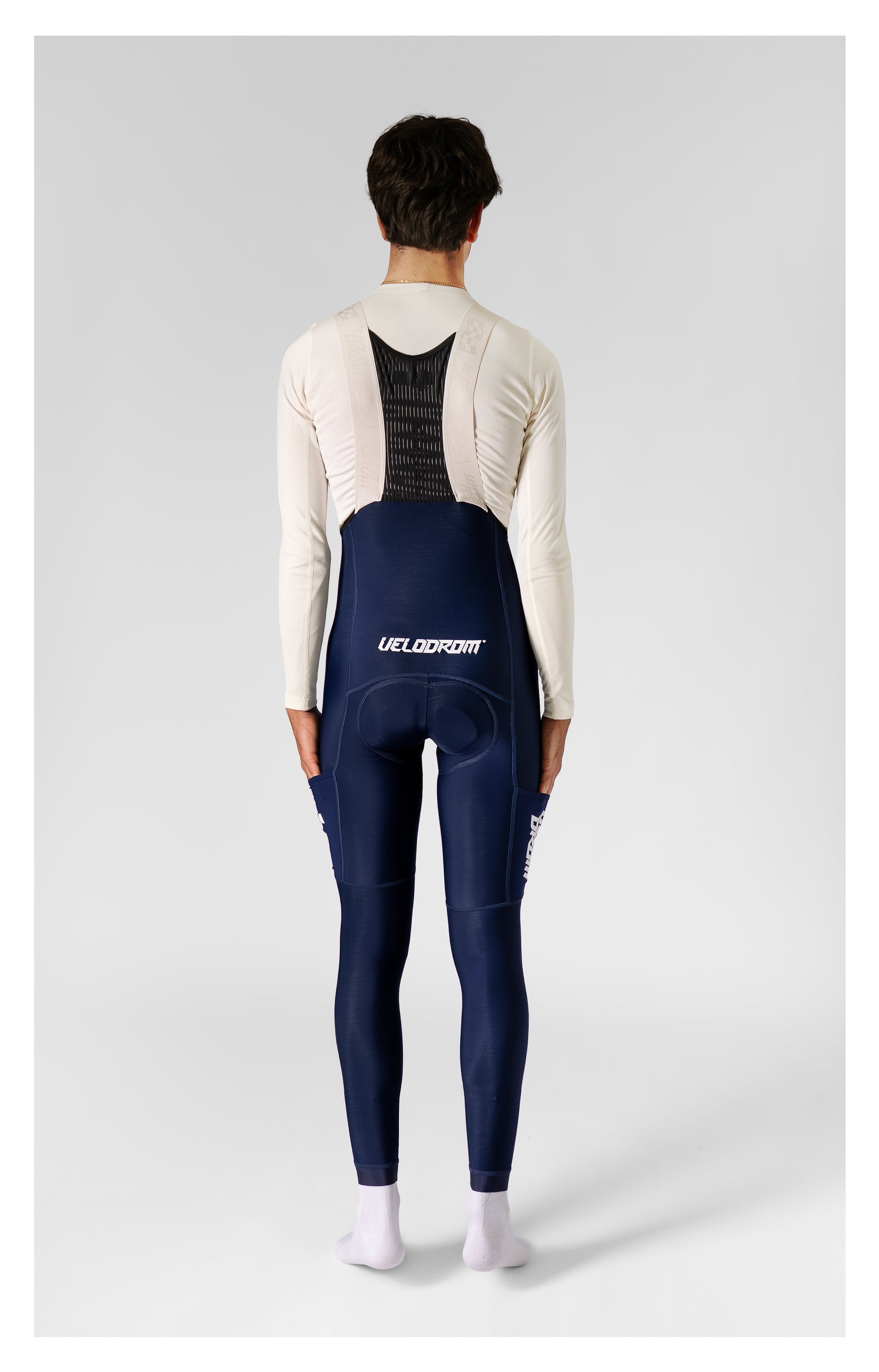 Le VELODROM RaceDay 3.0 Thermal Cargo Bib Tights in Navy/White sono collant con bretelle progettati per l'uso in condizioni di tempo più fresco. Questi collant offrono isolamento termico e spazio di stivaggio integrato, rendendoli adatti per il ciclismo su strada a lunga distanza, l'allenamento e le uscite di endurance. Il prodotto è destinato ai ciclisti che cercano comfort, calore e praticità di stoccaggio durante periodi prolungati in sella.