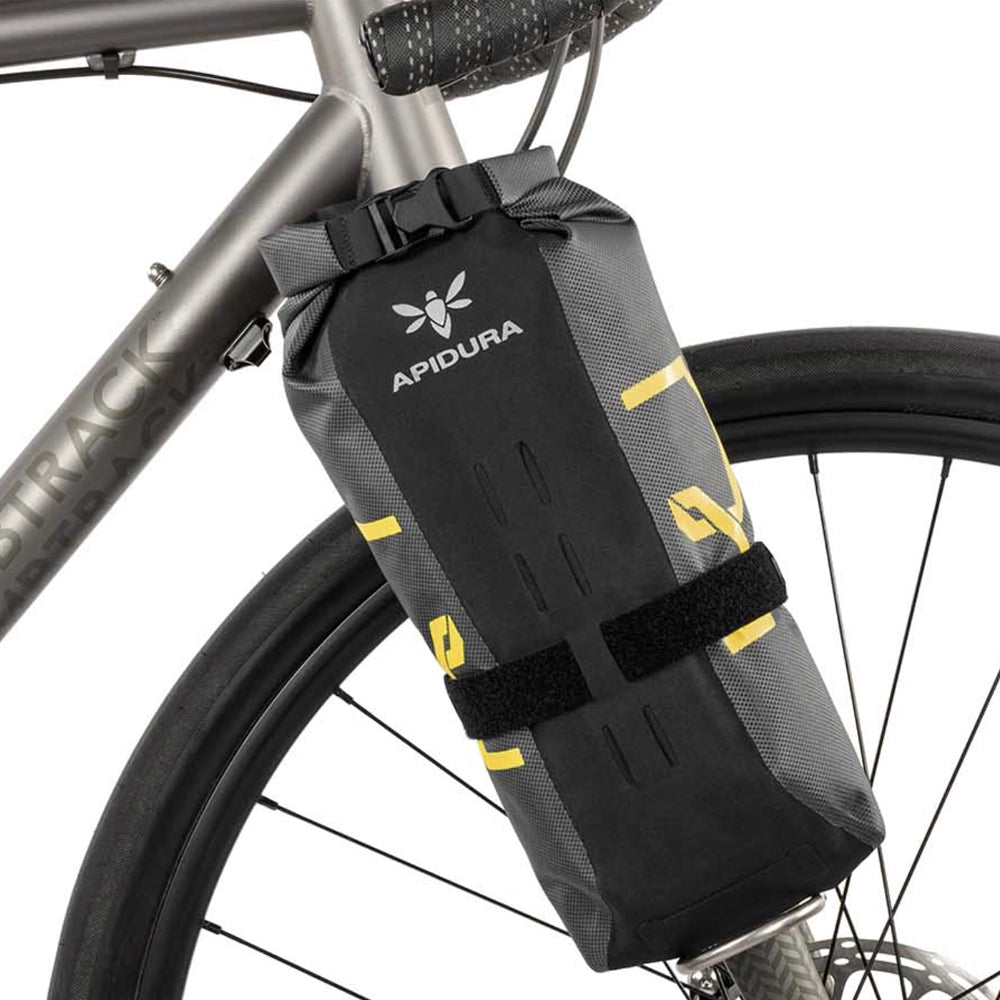The Expedition Fork Pack is a versatile and lightweight waterproof storage bag that easily attaches to any fork cage, providing extra storage space for all your biking adventures. Made from a durable laminate material, this 3L bag is perfect for storing compressible items like sleeping gear and clothing, as well as bulkier items such as cooking gear and food.