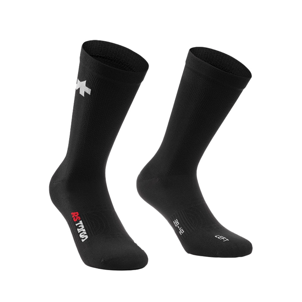 The ASSOS RS Socks Targa - Black are technical cycling socks designed for use in road cycling and high-performance riding environments. Manufactured by ASSOS, these socks are intended to provide comfort, breathability, and support during intensive cycling sessions. They are suitable for both training and competitive use.