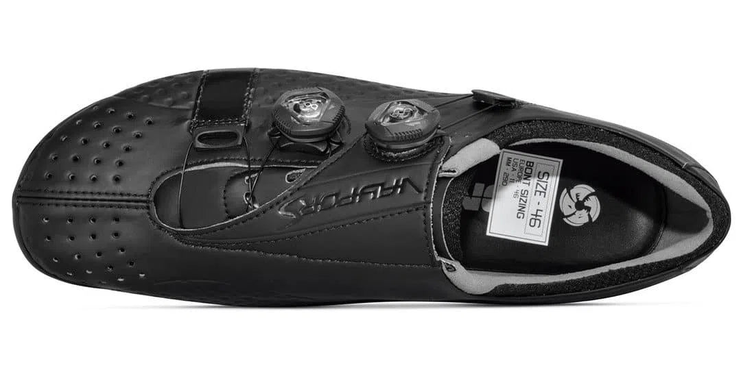 Introducing the Vaypor S road cycling shoes, designed to redefine pro level standards with a focus on speed and comfort. These shoes offer the most anatomically and biomechanically correct platform for efficient power transfer. Made with a Unidirectional Carbon Monocoque Chassis, Durolite Upper, and Faux Suede Leather Liner, the Vaypor S is lightweight at 230 grams. Featuring a stack height of 3.6 mm, frontal area air vents, and air gills in the arch area for ventilation. The EVA thermo-moldable innersole and memory foam padding ensure comfort, while the dual dial retention system with Kevlar wiring provides a secure fit. Available in various color options, the Vaypor S is the ultimate choice for performance-driven cyclists.