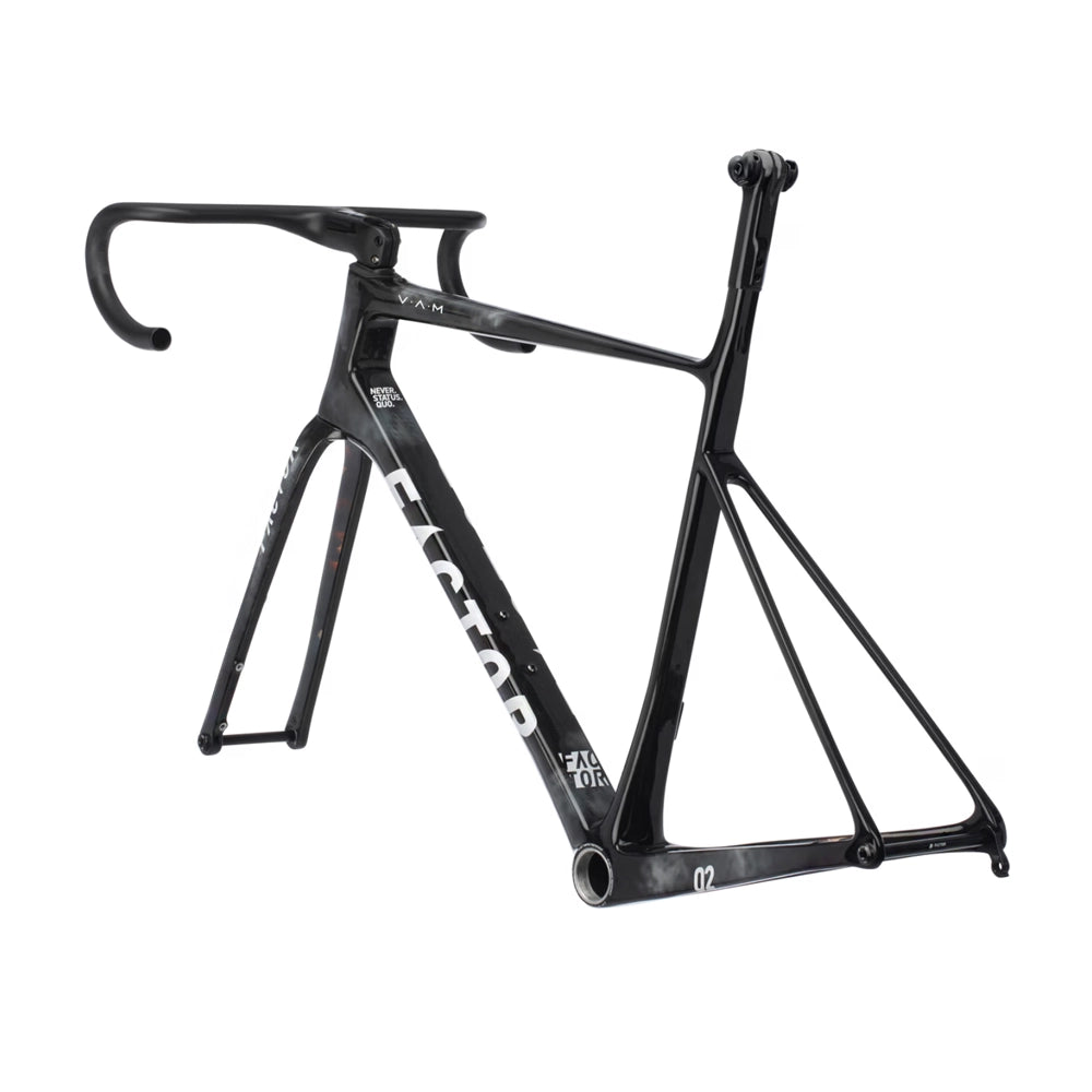 The FACTOR O2 VAM DISC FRAMESET - Storm is a high-performance road frameset designed for competitive and endurance cycling. It is engineered to provide a lightweight and aerodynamic platform suitable for disc brake systems. This frameset is typically used by cyclists seeking efficient power transfer and responsive handling on paved roads.