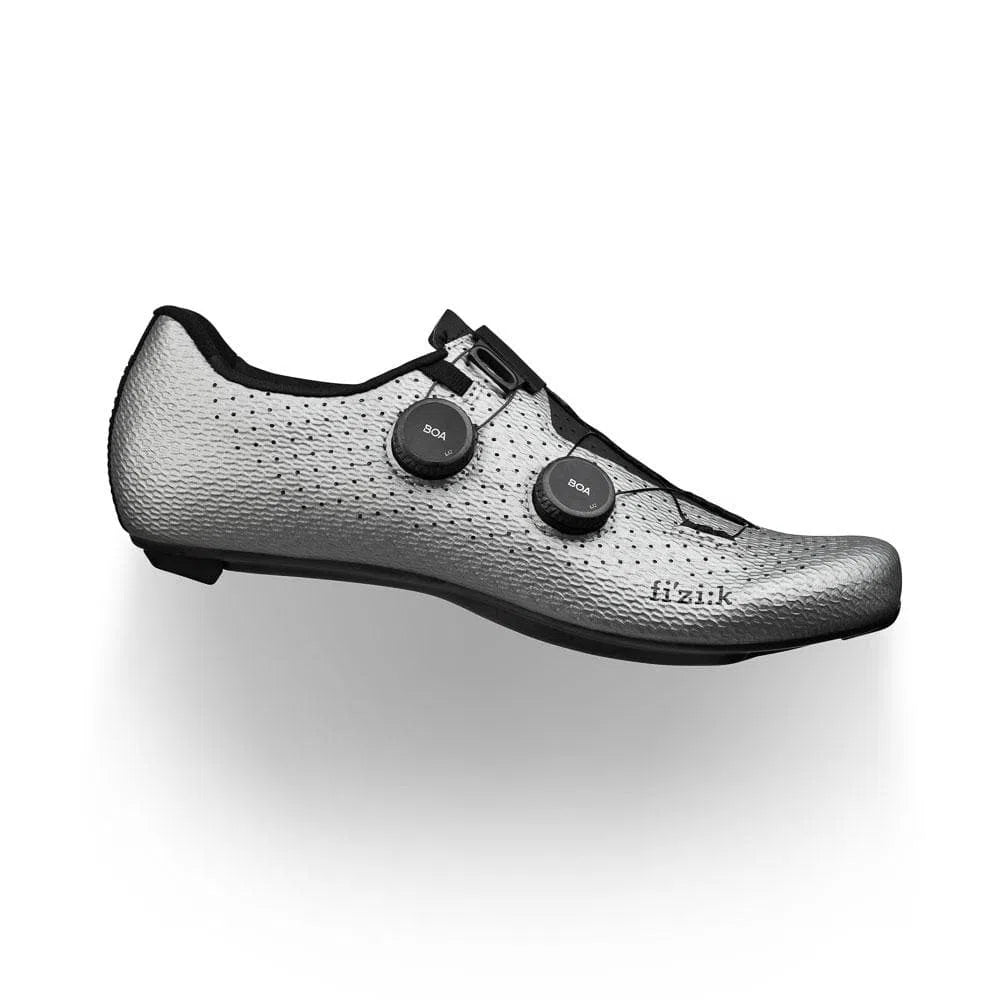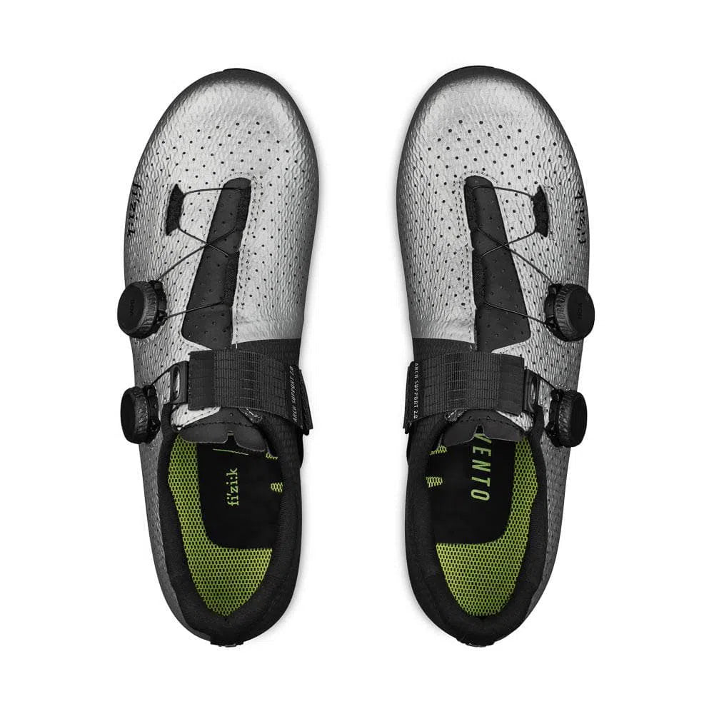 The FIZIK Road Cycling Shoes Vento Stabilita Carbon - Silver Black are specialized footwear designed for road cycling applications. These shoes are intended to provide efficient power transfer, secure fit, and comfort during long-distance rides or competitive events. Suitable for cyclists seeking high-performance features, the Vento Stabilita Carbon model is compatible with standard road pedal systems.