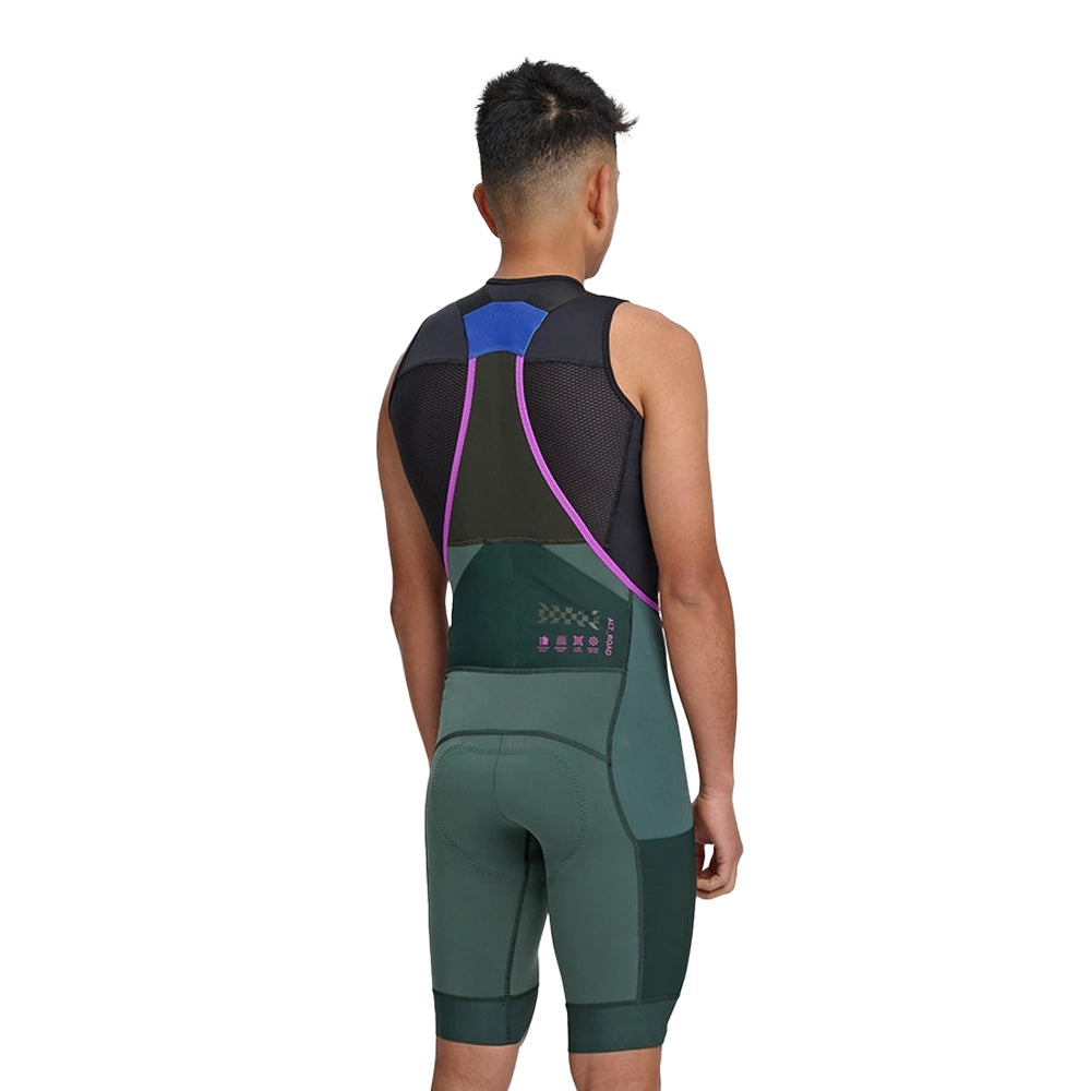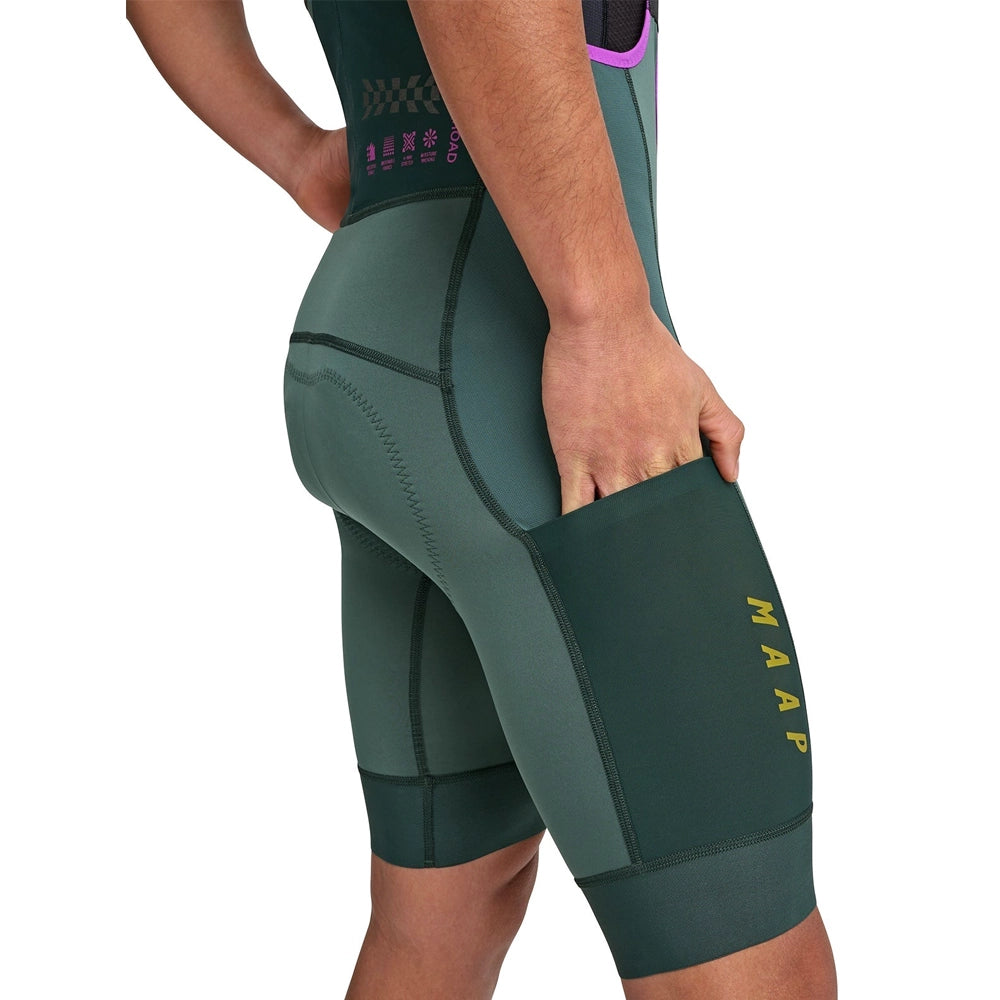Introducing the MAAP Alt Road Cargo Bib Shorts - Cypress Green, designed for long-distance rides. Crafted with lightweight, 4-way stretch compressive material, these bib shorts offer both comfort and durability. The 3D thermo moulded, 3-layer chamois features lazer cut perforations for breathability and an antimicrobial liner for all-day riding comfort. Abrasion-resistant side leg panels provide extra protection, while flatlock stitched internal seams prevent skin abrasion. These shorts also include an open cargo pocket, a zippered pocket, dual rear pockets for snacks, and high airflow mesh for breathability. With moisture-wicking, quick-drying, and anti-odour properties, along with reflective branding, these bibs are perfect for any ride.