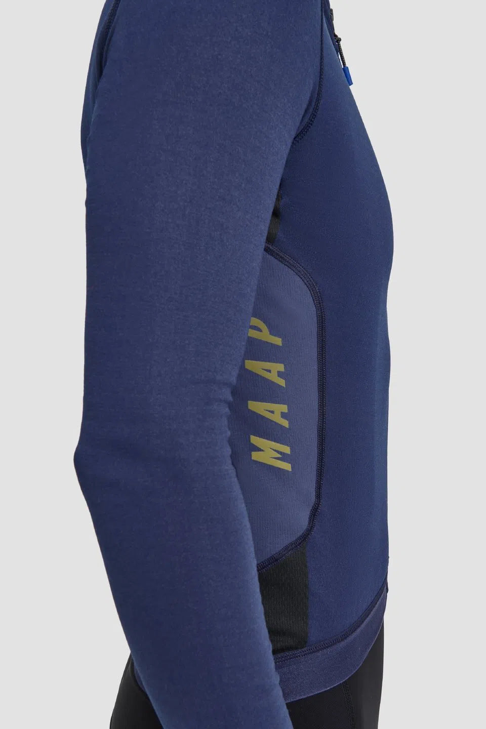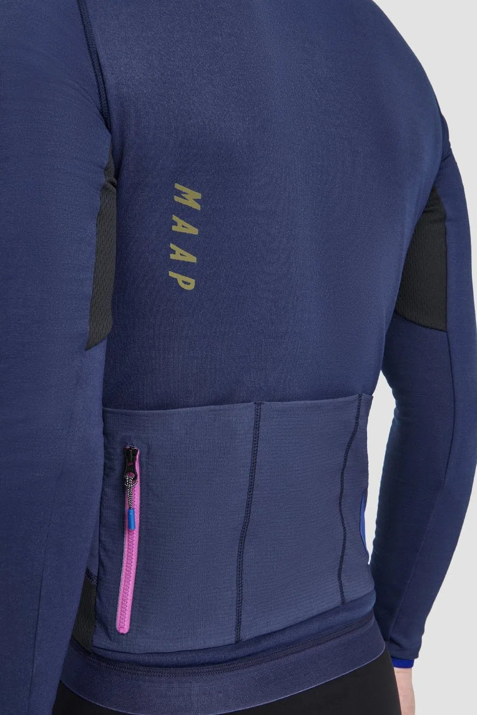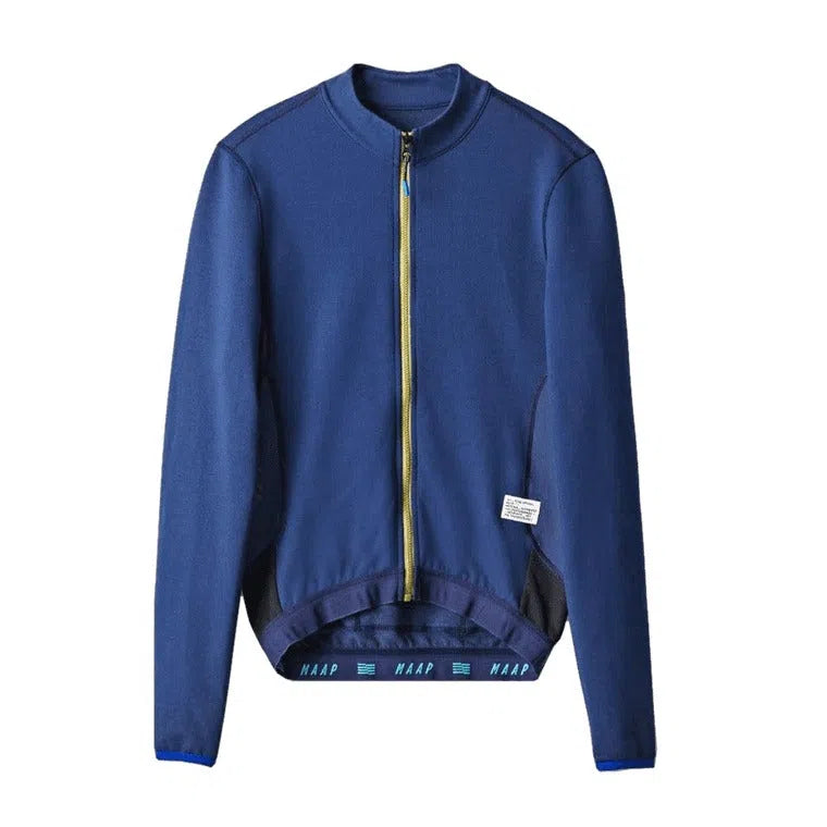 Introducing the MAAP Alt Road Long Sleeve Jersey in Blue from the Alt Road Collection, perfect for gravel and bike packing adventures. Crafted with a mid-weight stretch merino wool blend, this jersey offers natural wool technology for moisture management and insulation. It also boasts antimicrobial properties, UV protection, and durable YKK zippers for added functionality. The elastic hem band and stretch ripstop Cordura back pocket provide comfort during long rides. With reflective patches and branding, this jersey ensures visibility on the road.