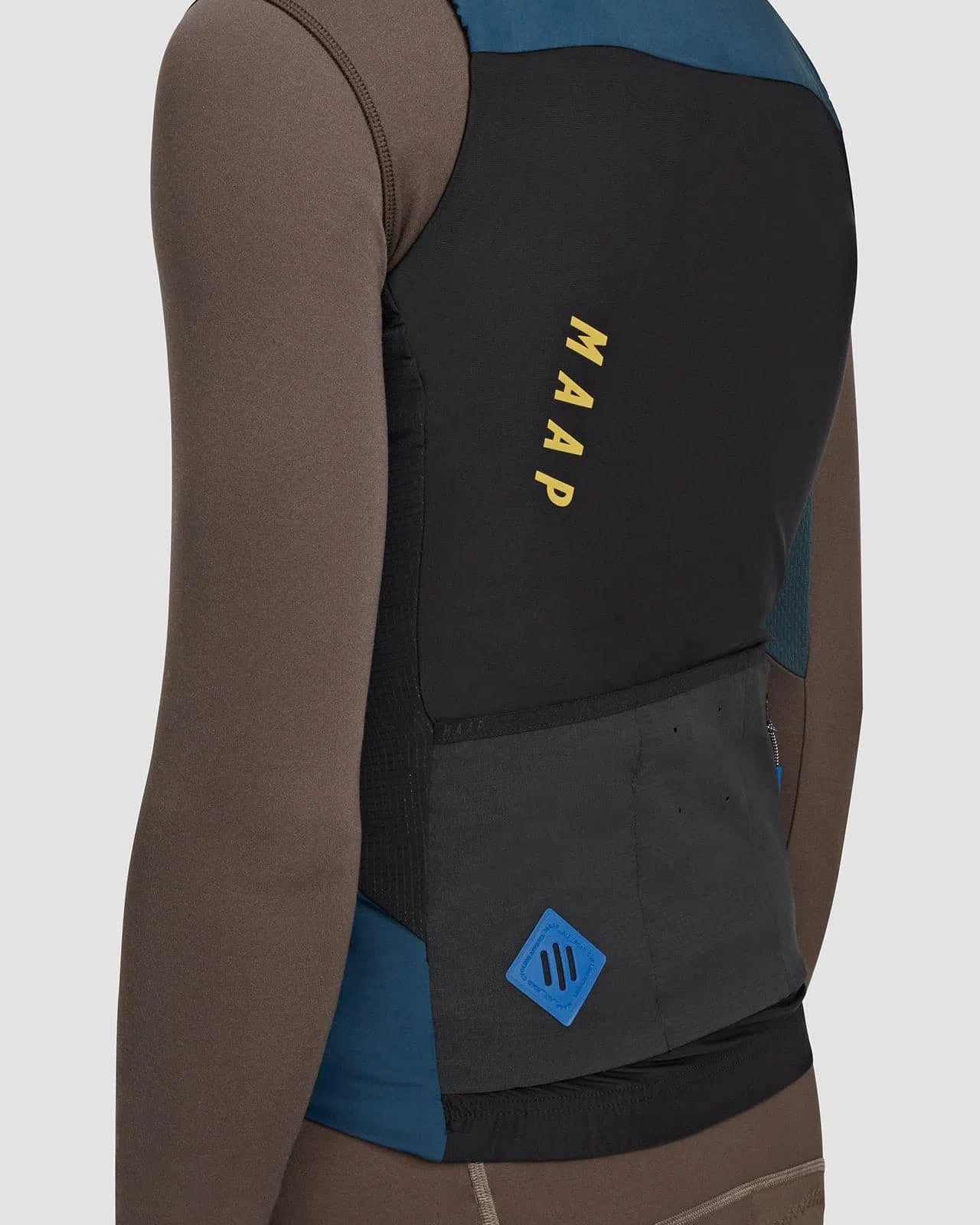 Experience ultimate comfort and protection with the MAAP Alt Road Thermal Vest in Dark Teal. This vest is designed for off-grid adventures, featuring body mapping technology and a Polartec® Alpha® body lining for optimal thermal regulation. The windproof and lightweight outer layer, combined with the DWR coating, ensures added protection to keep you warm in any situation.