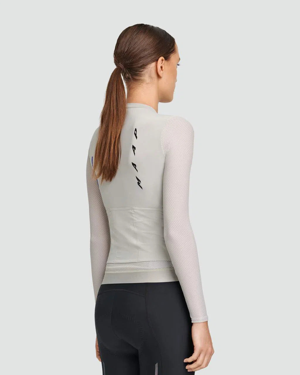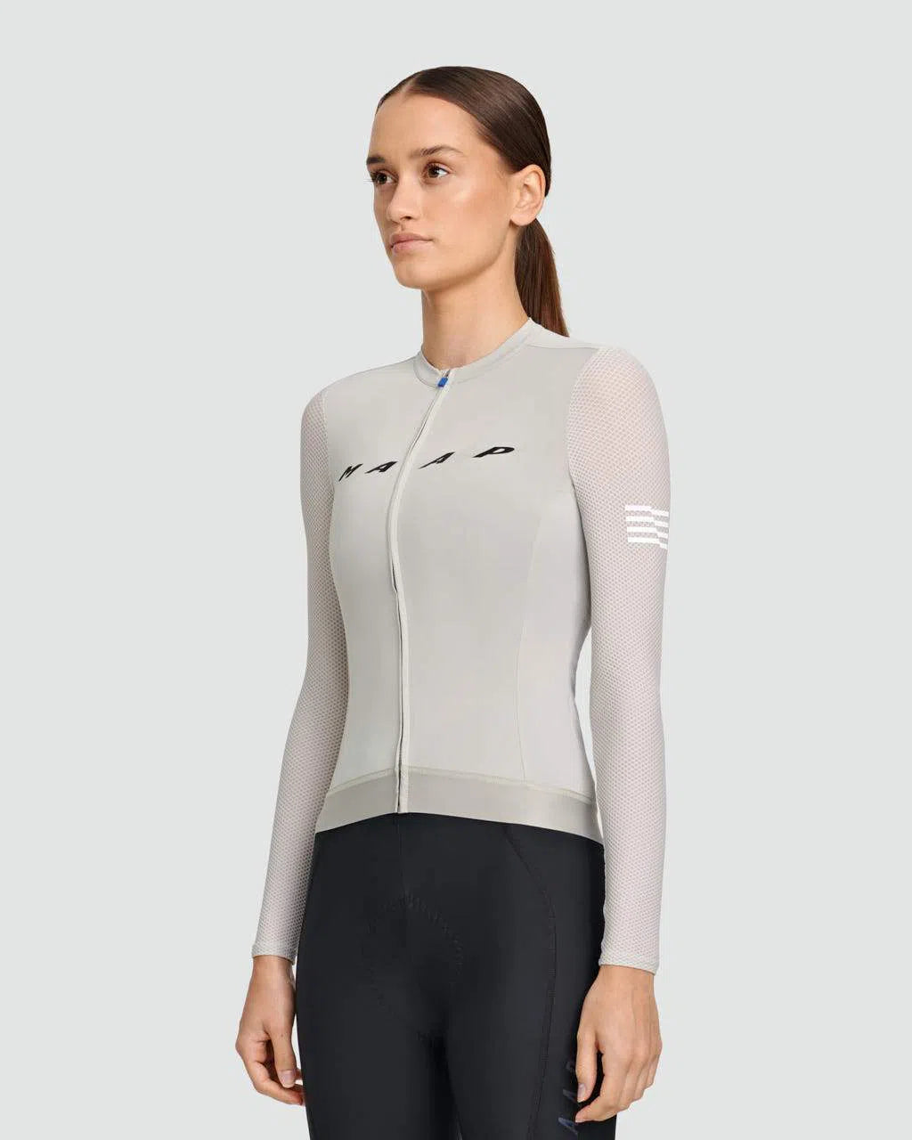 The MAAP Evade Pro Base LS Women Jersey - Fog is designed with honeycomb mesh sleeves and ultra-soft Italian fabrics for increased airflow and comfort. Reflective graphics provide 360-degree visibility, while SPF50+ sun protection keeps you covered on long rides.