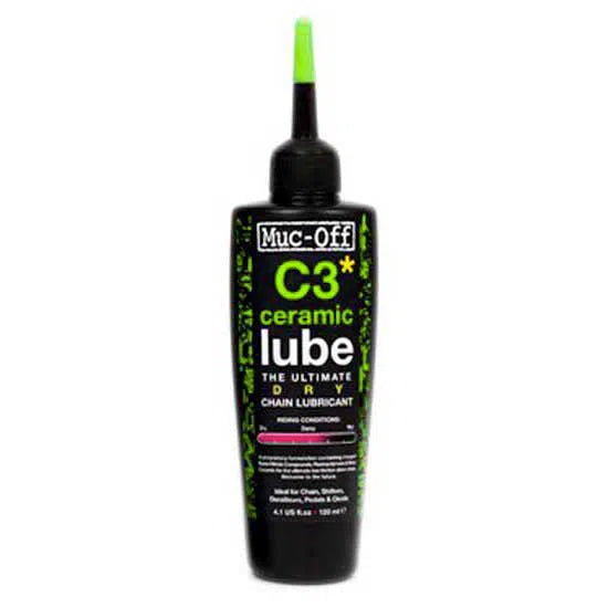 The MUC OFF C3 CERAMIC LUBE PREMIUM DRY - 120ml is a bicycle chain lubricant designed for dry weather conditions. It is formulated to reduce friction and wear on drivetrain components, supporting efficient gear shifting and prolonged chain life. This product is suitable for road, mountain, and commuter bikes requiring low-residue lubrication in dry environments.