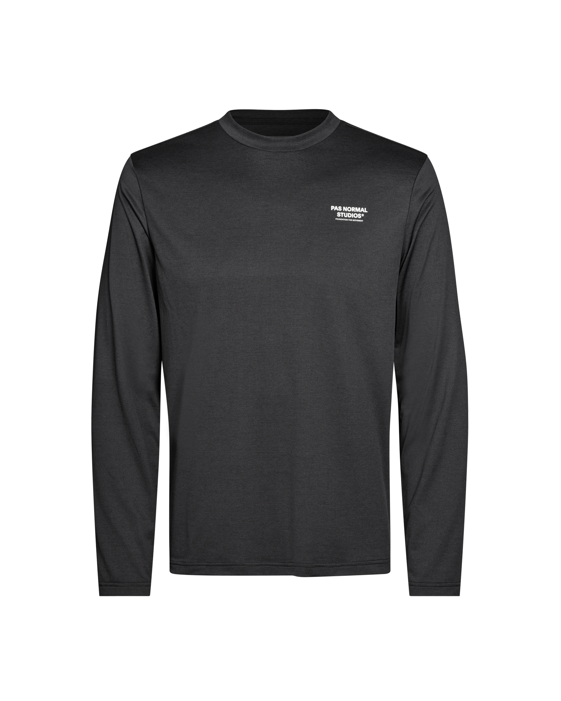 The PAS NORMAL STUDIOS Balance Long Sleeve Tshirt - Black is a technical long-sleeve t-shirt designed for cycling and active use. It is intended to provide comfort and functionality during rides or as a versatile layer for various conditions. This model is suitable for cyclists seeking a balance between performance and casual wear.