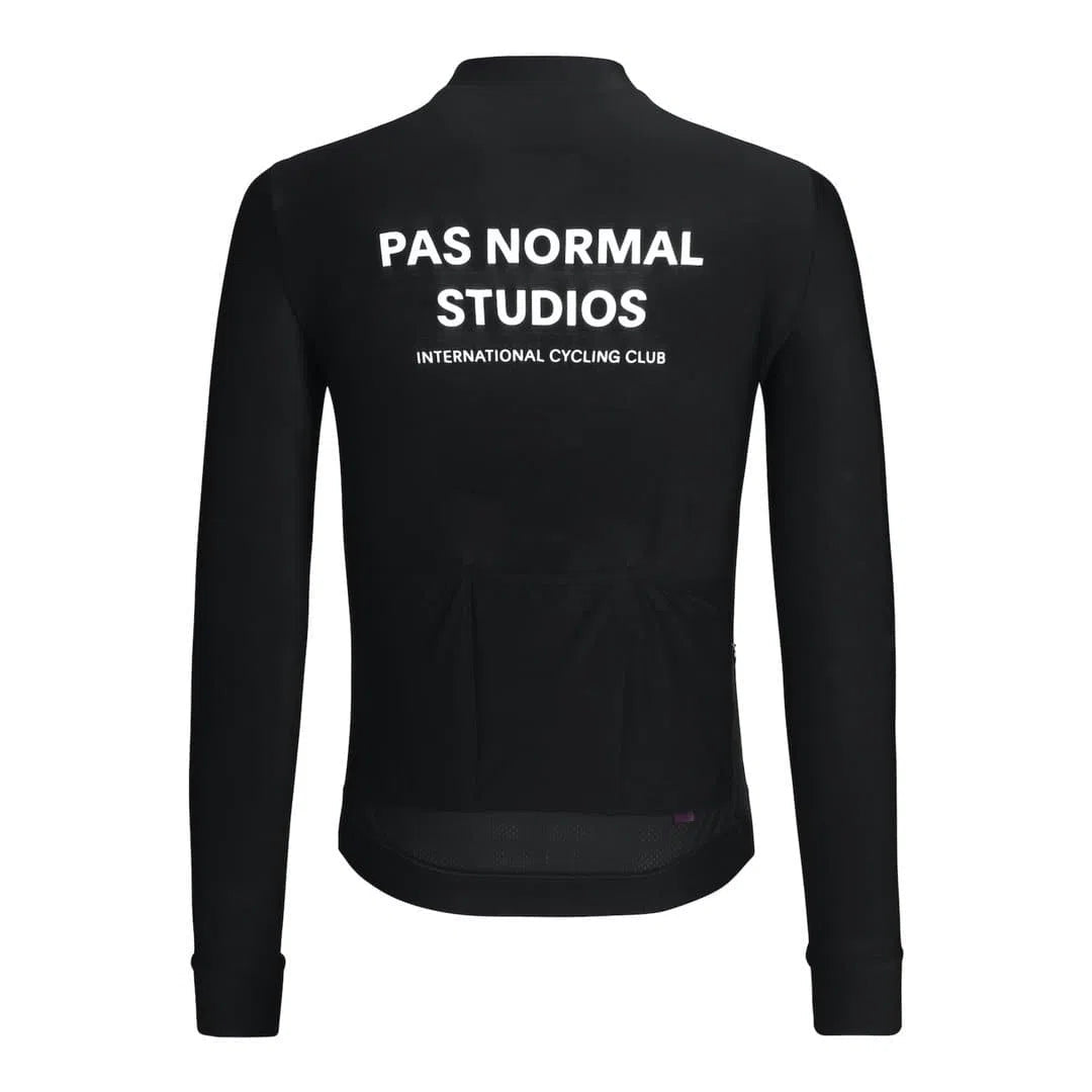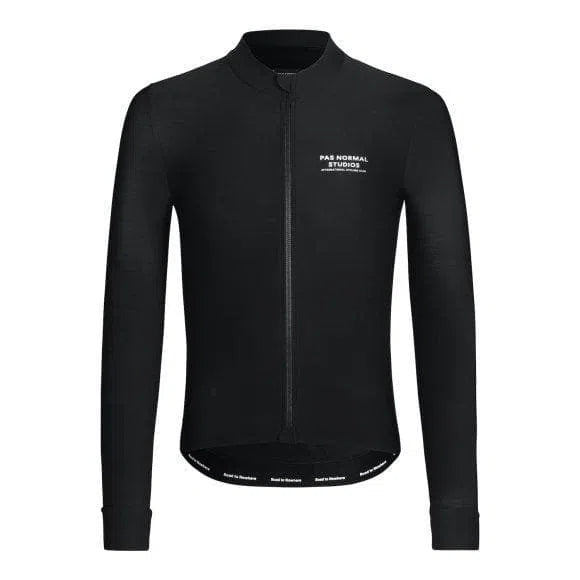 The PAS NORMAL STUDIOS Mechanism Long Sleeve Jersey - Black is a cycling jersey designed for use in cooler weather conditions. This long sleeve jersey is intended for road cyclists seeking a balance of thermal regulation and aerodynamic fit. It is suitable for training, racing, or extended rides where lightweight insulation and breathability are required.