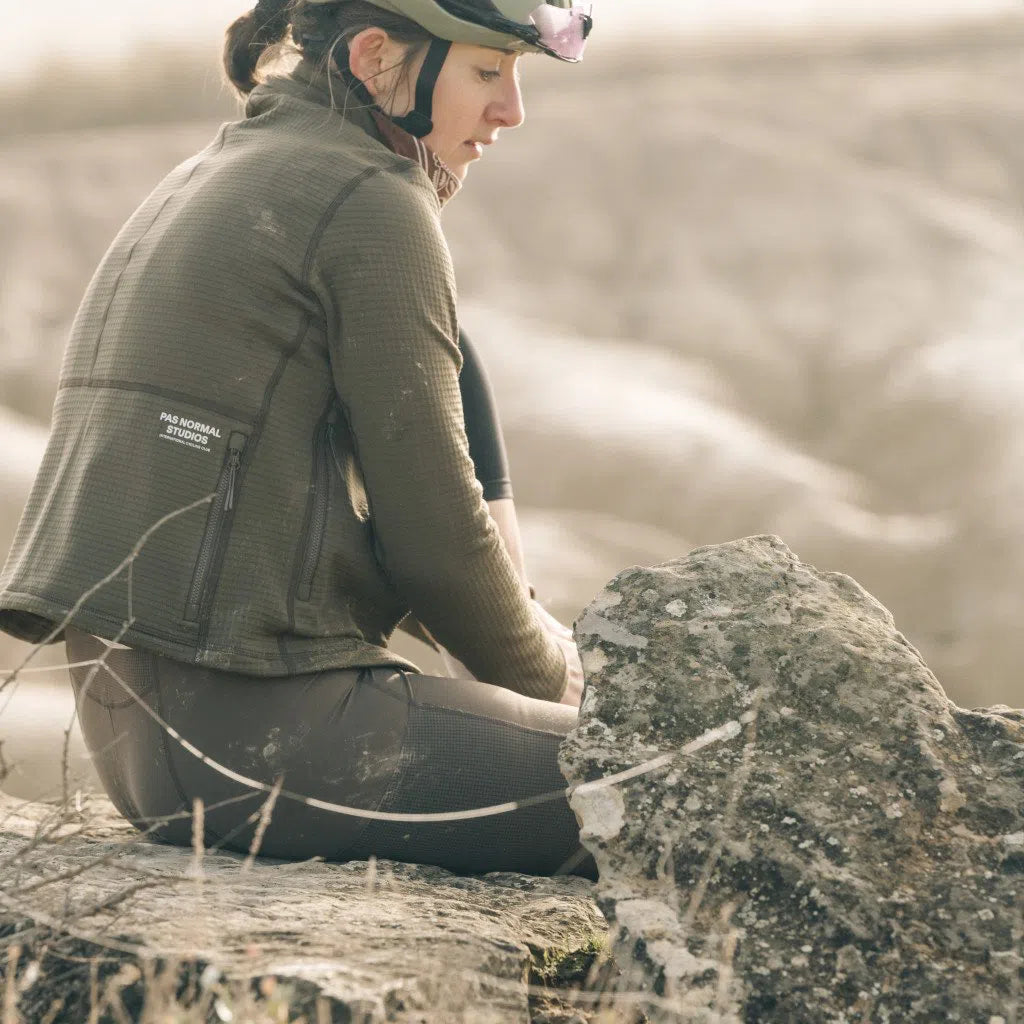 Introducing the PAS NORMAL STUDIOS ESCAPISM Performance Fleece Zip Jersey in Dark Stone, designed for optimal function both on and off the bike. This jersey offers exceptional thermal properties and a proper fit, thanks to its high wool content for thermo-regulation and open-grit structure for breathability and warmth. The Hybrid Fit design ensures comfort in any setting, whether in the city or on the fields.