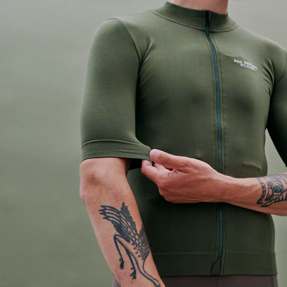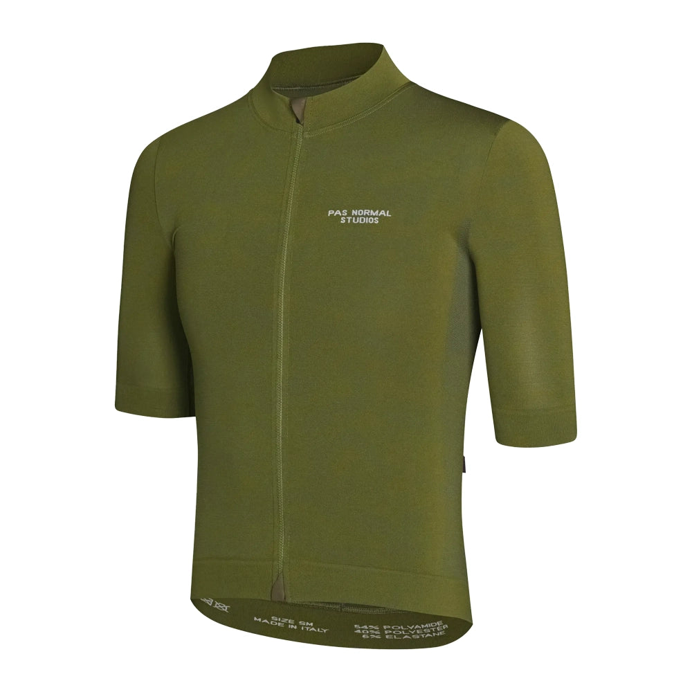 Introducing the PAS NORMAL STUDIOS Knit Jersey in Dark Moss - an essential addition to your cycling wardrobe. Made from high-quality, breathable materials, this jersey is designed for maximum comfort and performance on the road. The dark moss color adds a sleek and stylish touch to your outfit while the knit fabric provides a snug fit. With a full zip for adjustable ventilation and three spacious back pockets for storage, this jersey is perfect for long rides. Whether you're a seasoned pro or a beginner, the PAS NORMAL STUDIOS Knit Jersey is a must-have.