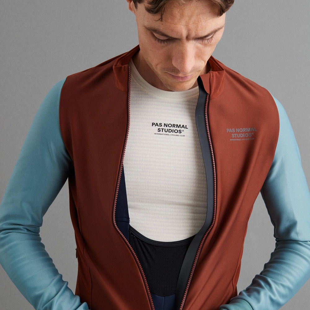 Introducing the Pas Normal Studios Mechanism Thermal Long Sleeve Jersey AW23 - Mahogany/Dusty Teal. Crafted from wind and water repellent Schoeller fabrics and M.I.T.I SuperRoubaix fleece, this jersey is designed for extreme weather conditions. Features include an anatomically fitting body for aerodynamic performance, DWR treated SuperRoubaix fabric on the back for softness and breathability, concealed front zipper with a heavy duty YKK zipper, and an ergonomic silicone waist gripper. Complete with a chest and reflective back logo, this jersey combines style and functionality for your next ride.