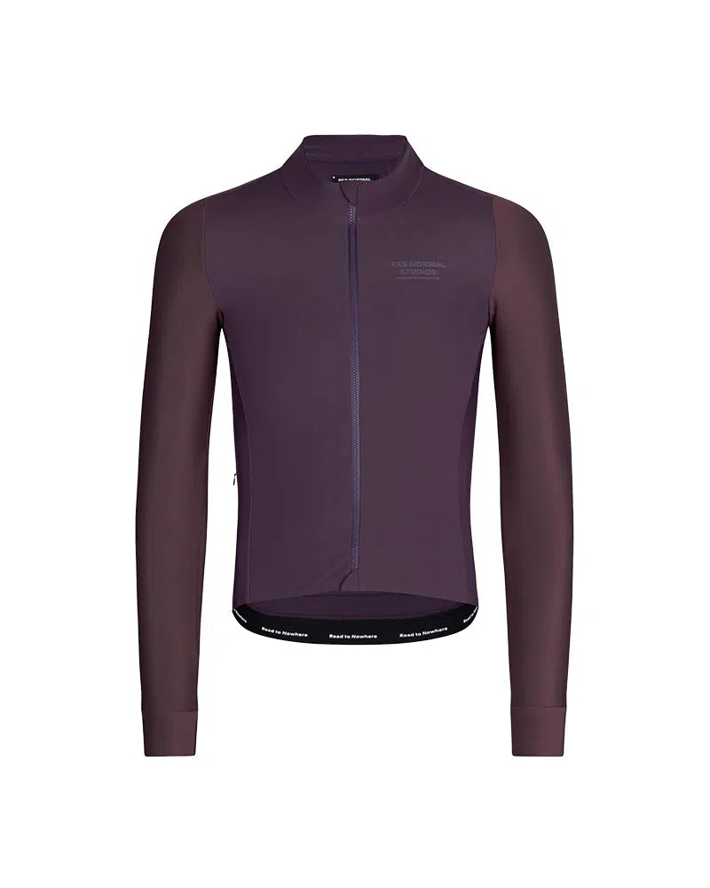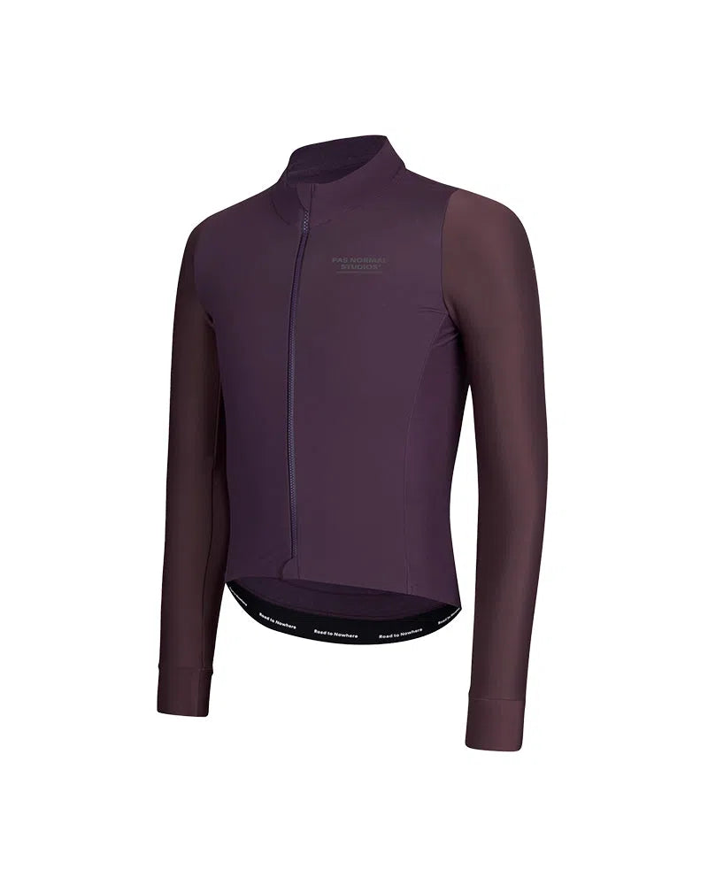 Introducing the PAS NORMAL STUDIOS Mechanism Thermal Long Sleeve Jersey AW22 - Bordeaux, designed to enhance comfort and performance during cycling adventures. Crafted with Swiss Schoeller wind and water repellent fabrics on the front and M.I.T.I SuperRoubaix fleece on the back, this jersey offers protection and breathability. Key features include Pas Normal Studios logos, a heavy-duty YKK zipper, tabs at the back of the neck to secure the zipper, zippered storage pockets, and DWR treatment for added hydrophobic properties.