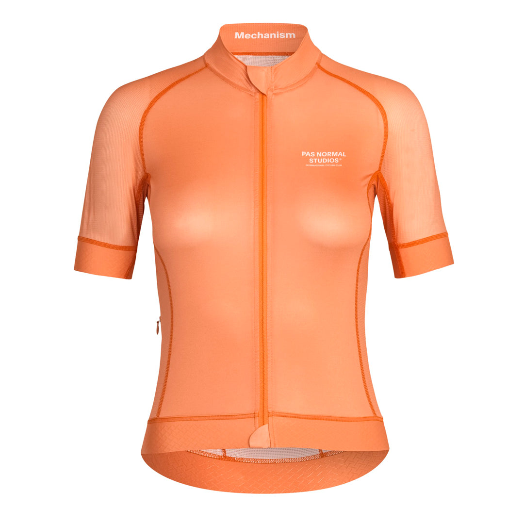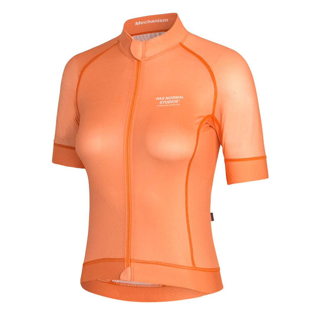 Discover the perfect integration between performance and fashion with the PAS NORMAL STUDIOS Mechanism Women Jersey - Coral. This signature cycling jersey from the PNS collection was designed for high-paced rides and races while maintaining style. It is made with super lightweight 86% polyester and 14% elastane fabrics, with perforated breathability fabrics on the side and rear panels. The super-slim fit design provides aerodynamics, and the jersey also boasts of a side pocket made of 100% polyester and a zippered side pocket. Made entirely in Italy, this feminine jersey is perfect for your hottest summer rides and it is recommended to size up 1 size from your normal cycling clothing. Be sure to check out the Pas Normal Studios website for more information.