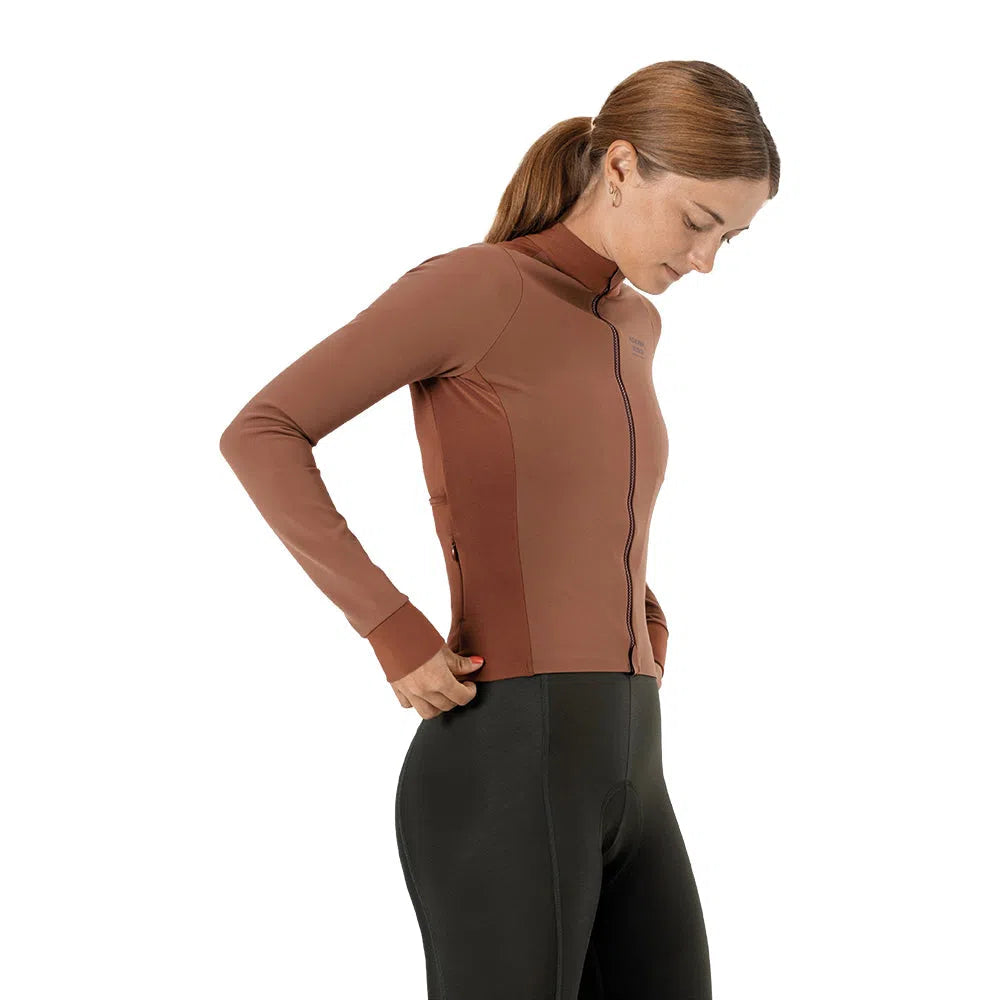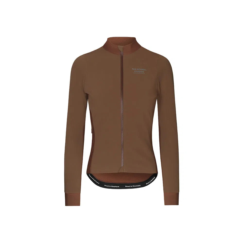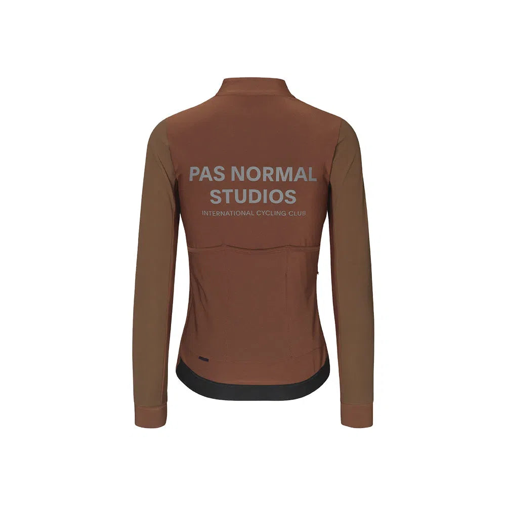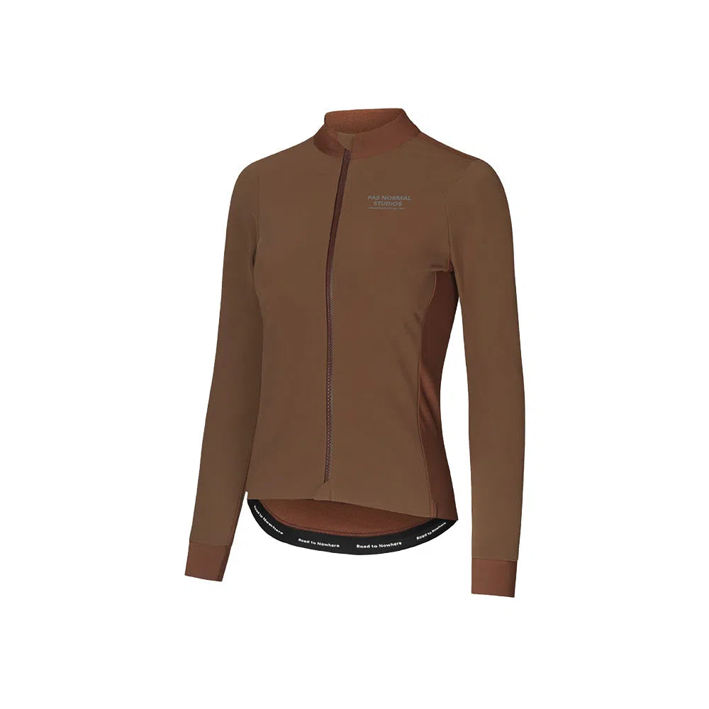 Introducing the PAS NORMAL STUDIOS AW22 Mechanism Women Thermal LS Jersey - Hazel, a modern cyclist's dream. This jersey combines comfort, performance, and style with technical fabrics for insulation and aerodynamics. Say goodbye to bulky layers with its sleek design and full-length zip for easy on/off. The ergonomic cut ensures comfort and freedom of movement, while secure rear pockets and elasticated pocket hems offer convenient storage and added security. PAS NORMAL STUDIOS' quality craftsmanship guarantees durability for another season of riding.