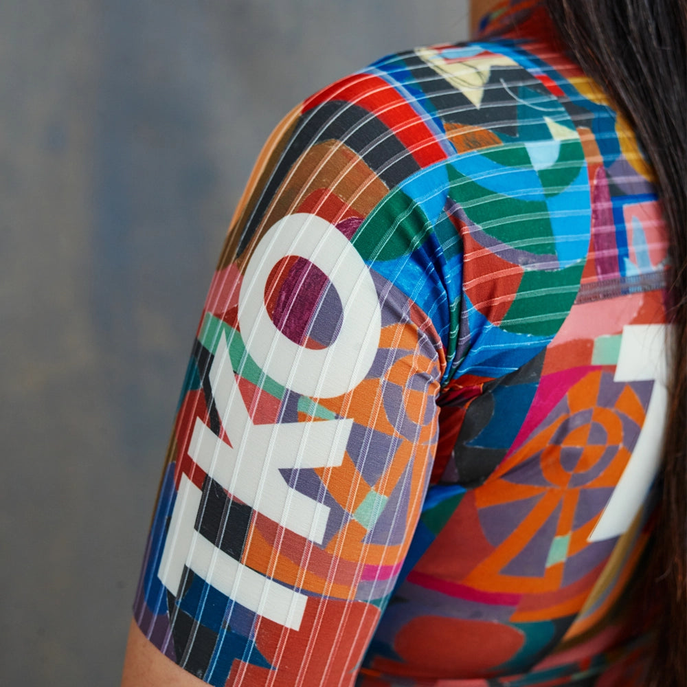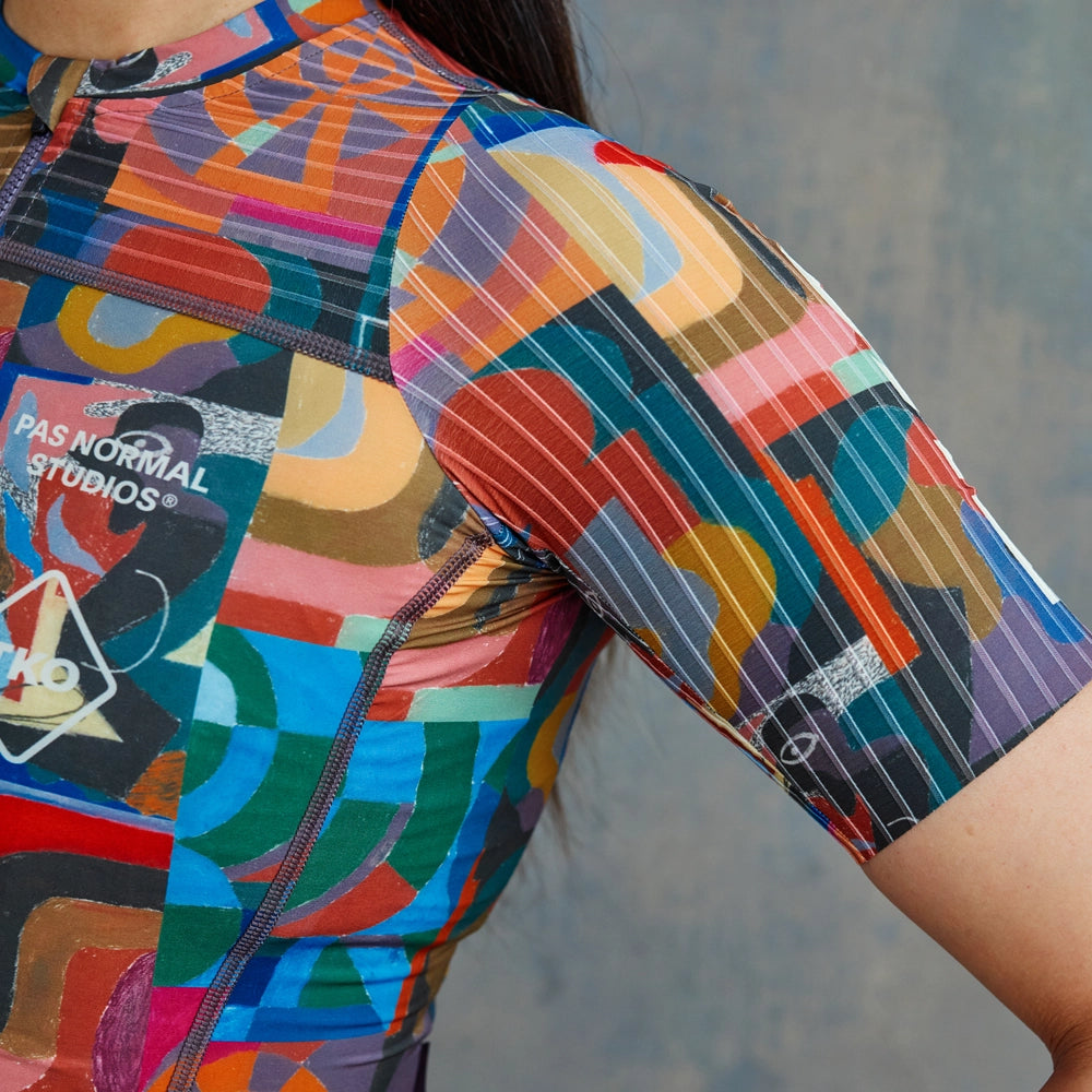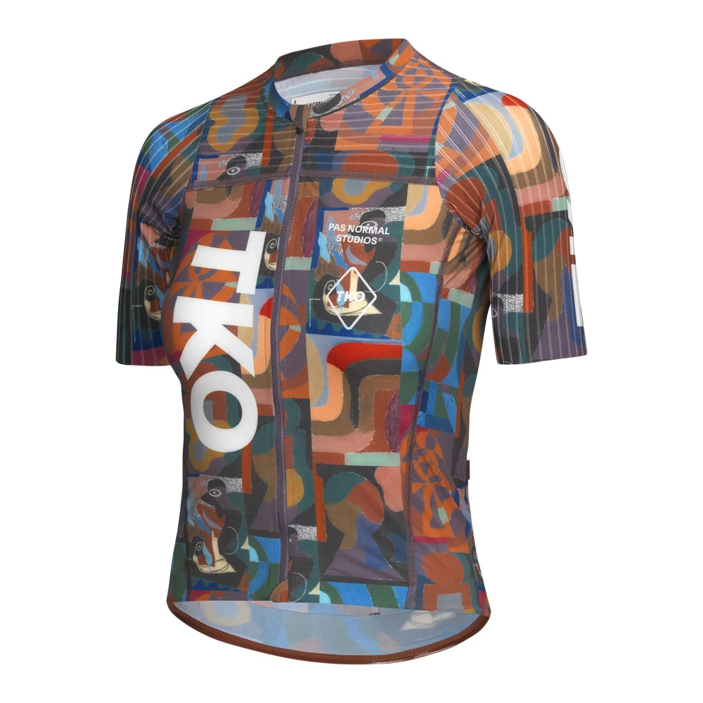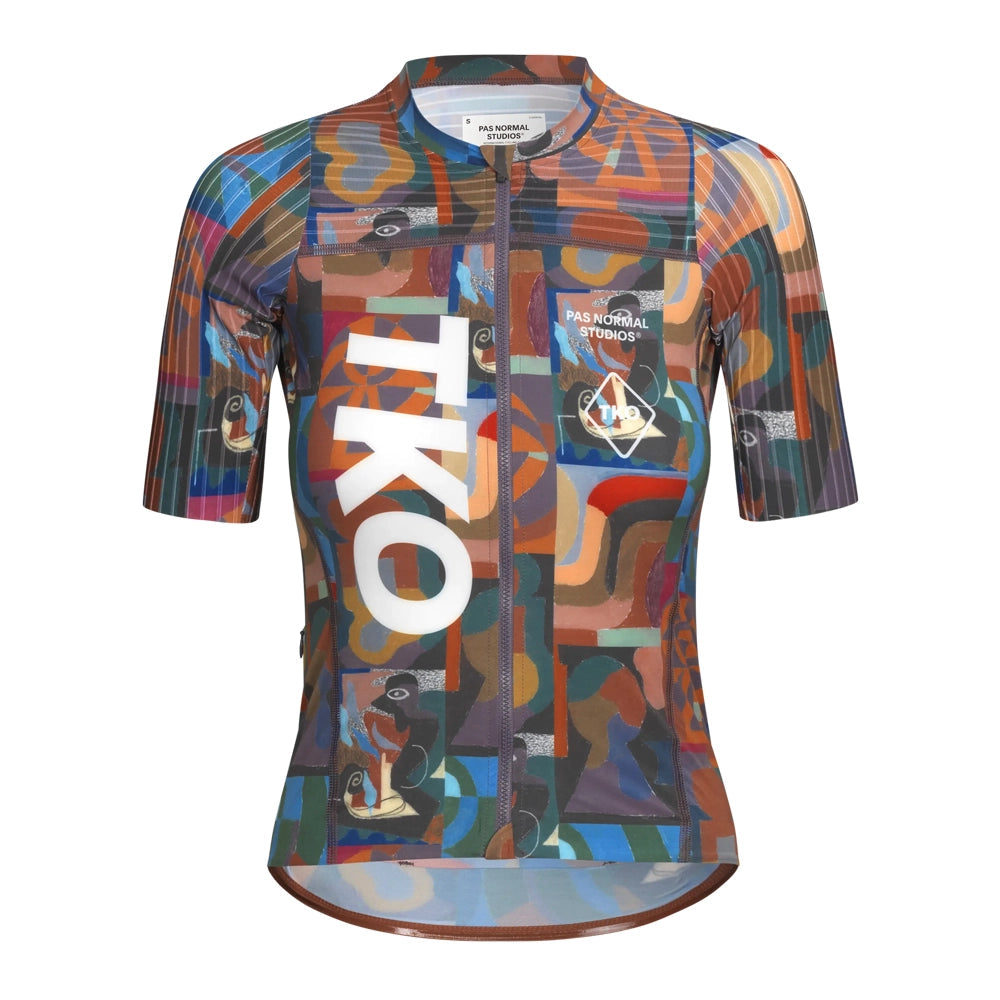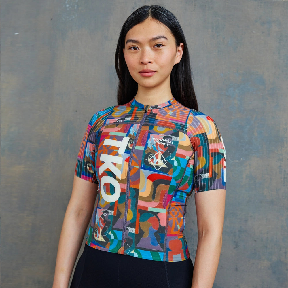 Introducing the PAS NORMAL STUDIOS TKO Essential Light Women Jersey SS24 - Multi. This high-performance cycling jersey is designed to help you conquer any ride with style and ease. Featuring a lightweight and breathable fabric, it offers maximum comfort and moisture-wicking properties to keep you cool and dry on hot days. Its slim fit and extended back hem provide a streamlined silhouette, while the full-length YKK zipper allows for easy temperature control. With three rear pockets for ample storage and reflective details for added visibility, this jersey is perfect for your next cycling adventure.