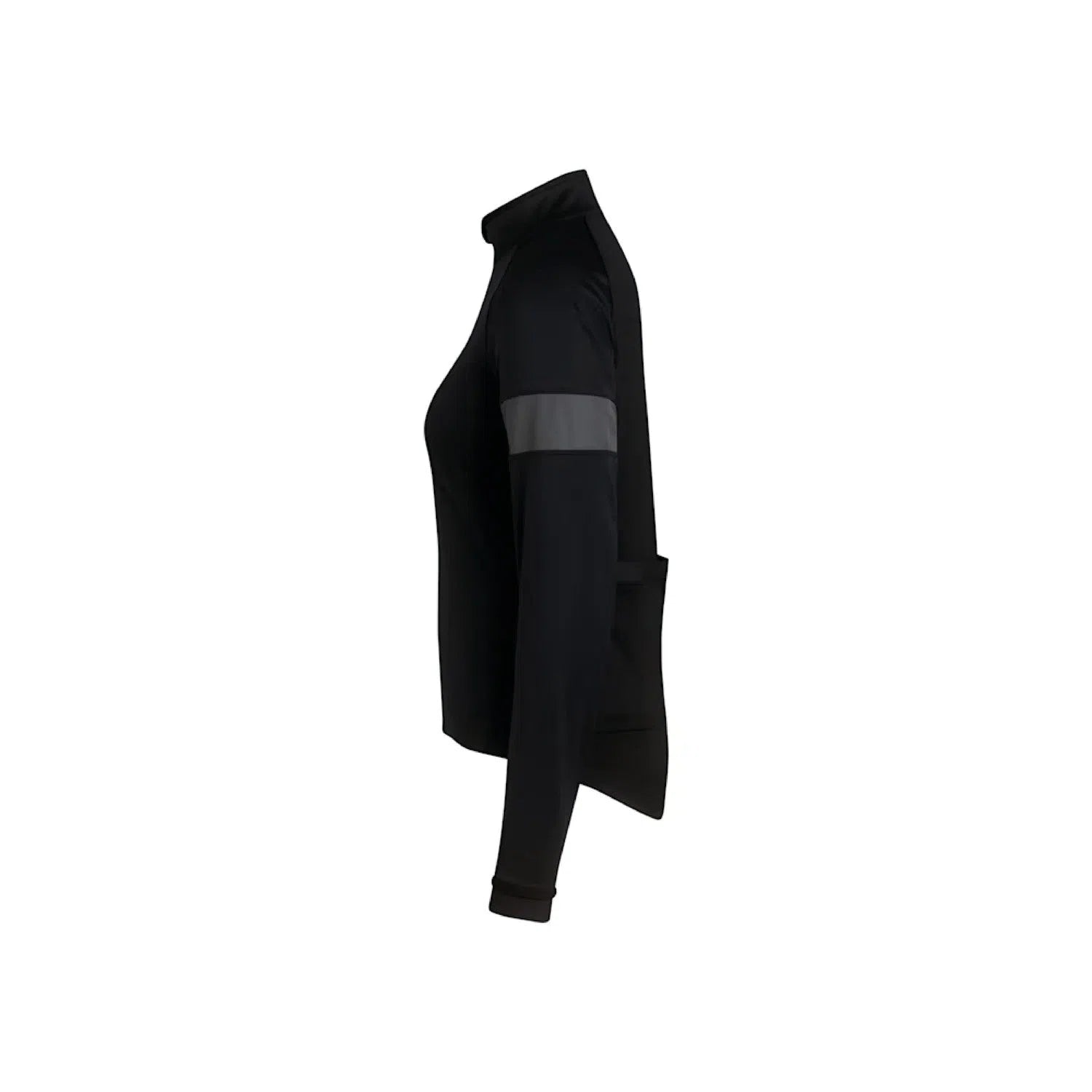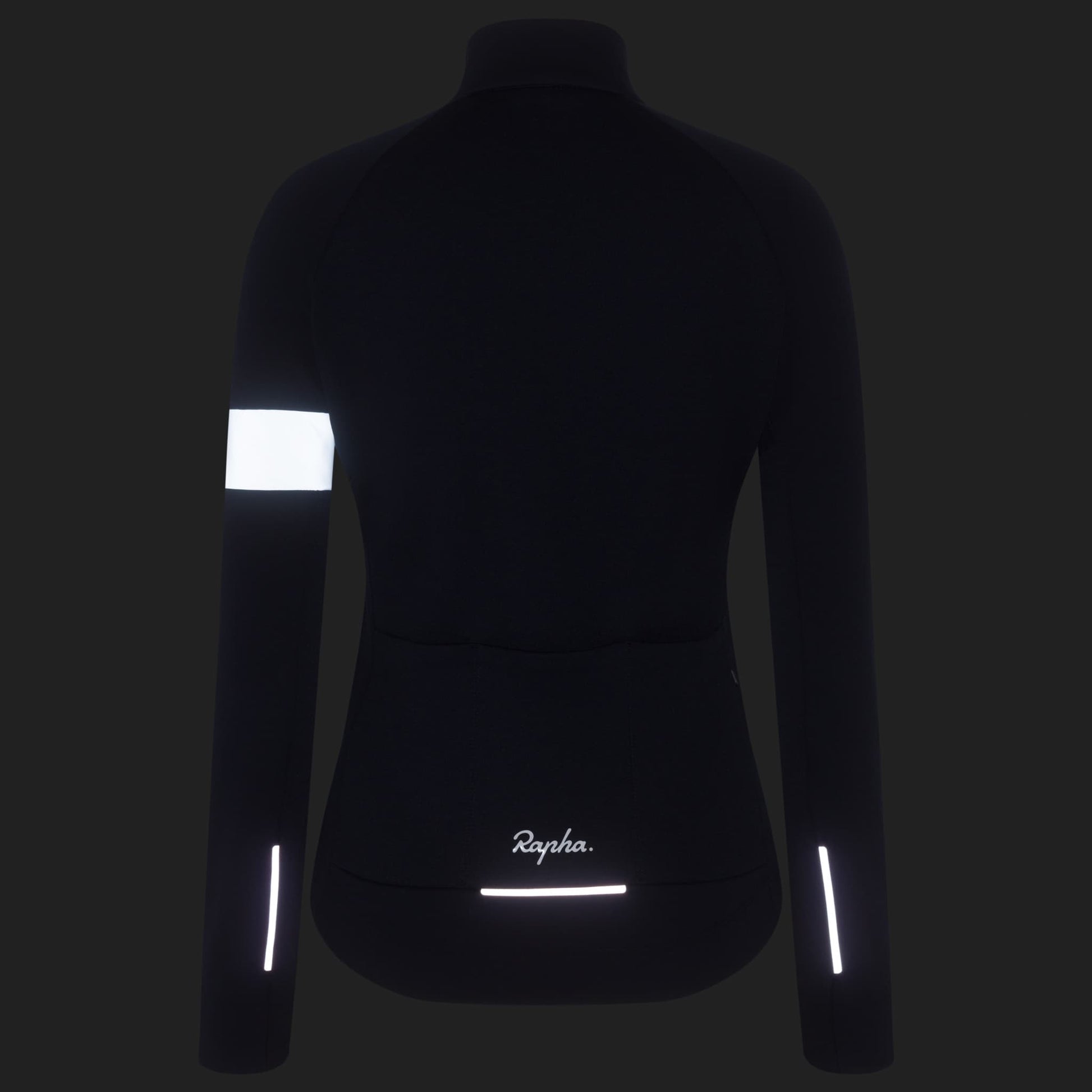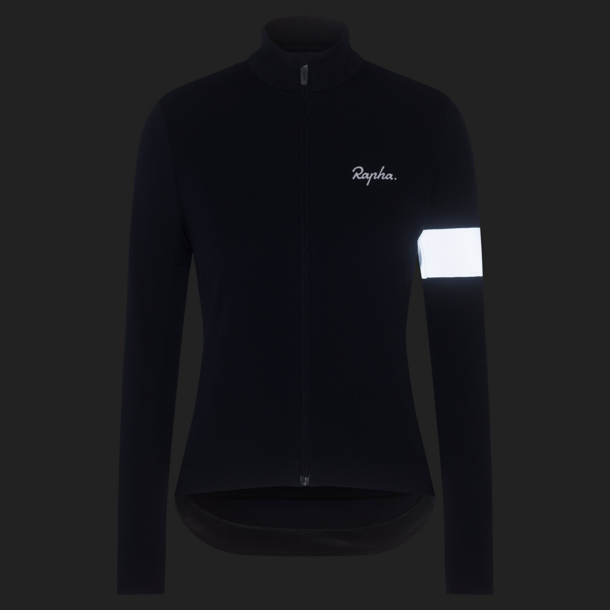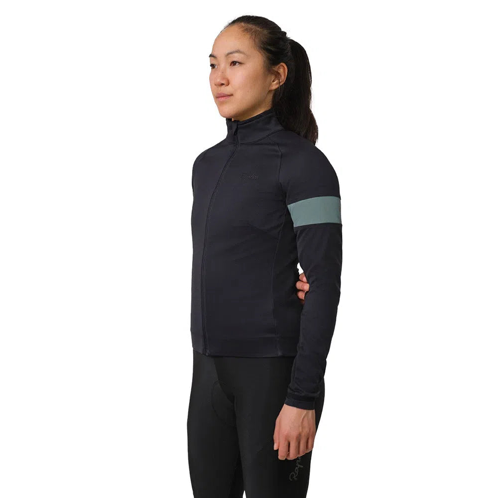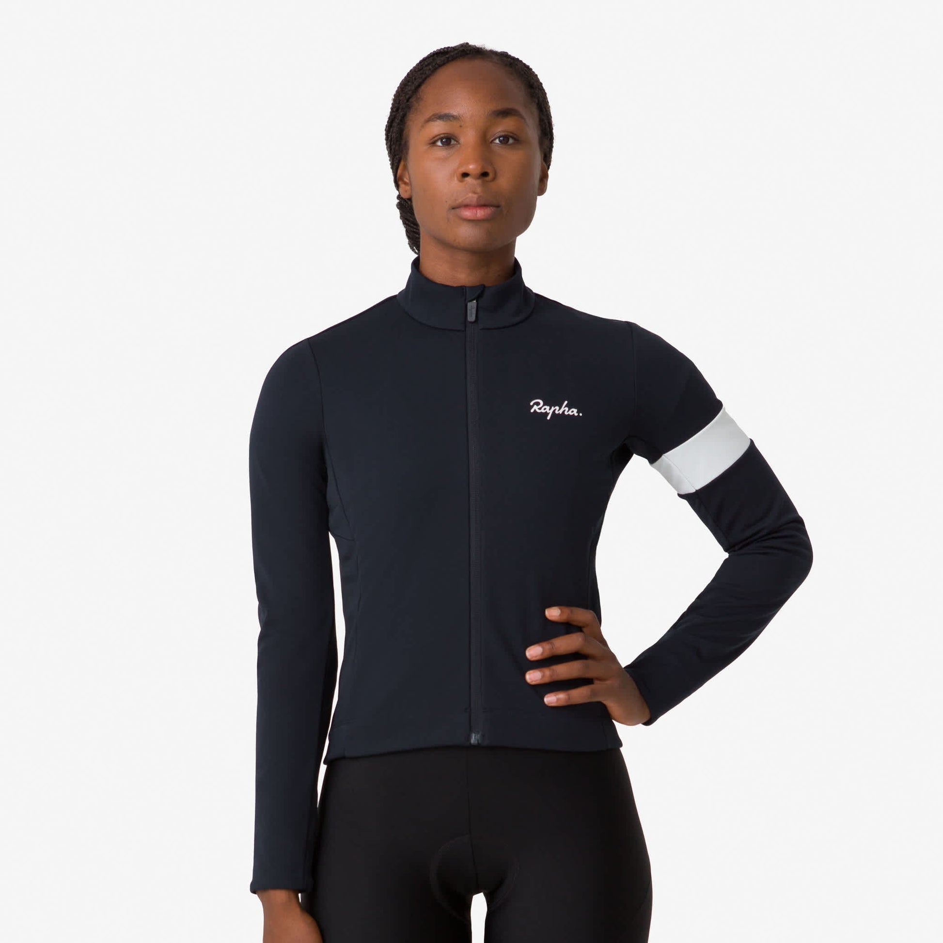The RAPHA Core Winter Women Jacket - Black/White is a cycling jacket designed for cold weather riding. It is intended to provide insulation and wind protection for women cyclists during winter conditions. The jacket is suitable for road cycling, commuting, and training in low temperatures.