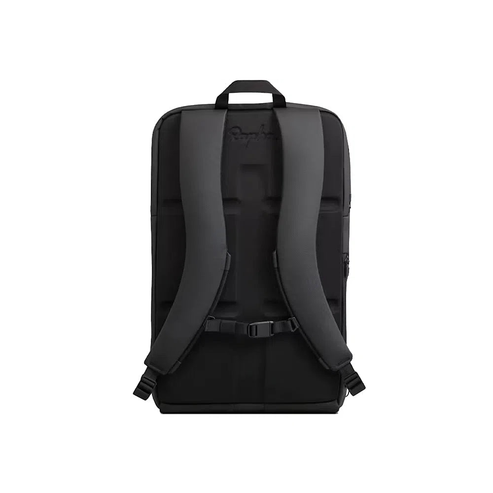 The RAPHA Travel Backpack - Black is a stylish and functional choice for urban or travel use. Featuring a matte main body with a waterproof coating, leather contrast stripe, and cast metal Rapha logo, this backpack is both durable and fashionable. Key features include a one-piece moulded back panel for comfort and airflow, a small zipped side pocket for quick access to essentials, and a clamshell design for easy packing and access. The bag also includes a padded laptop pocket, magnetic sternum strap, quick access front pocket, and a mesh pocket for the hi-vis pink rain cover.