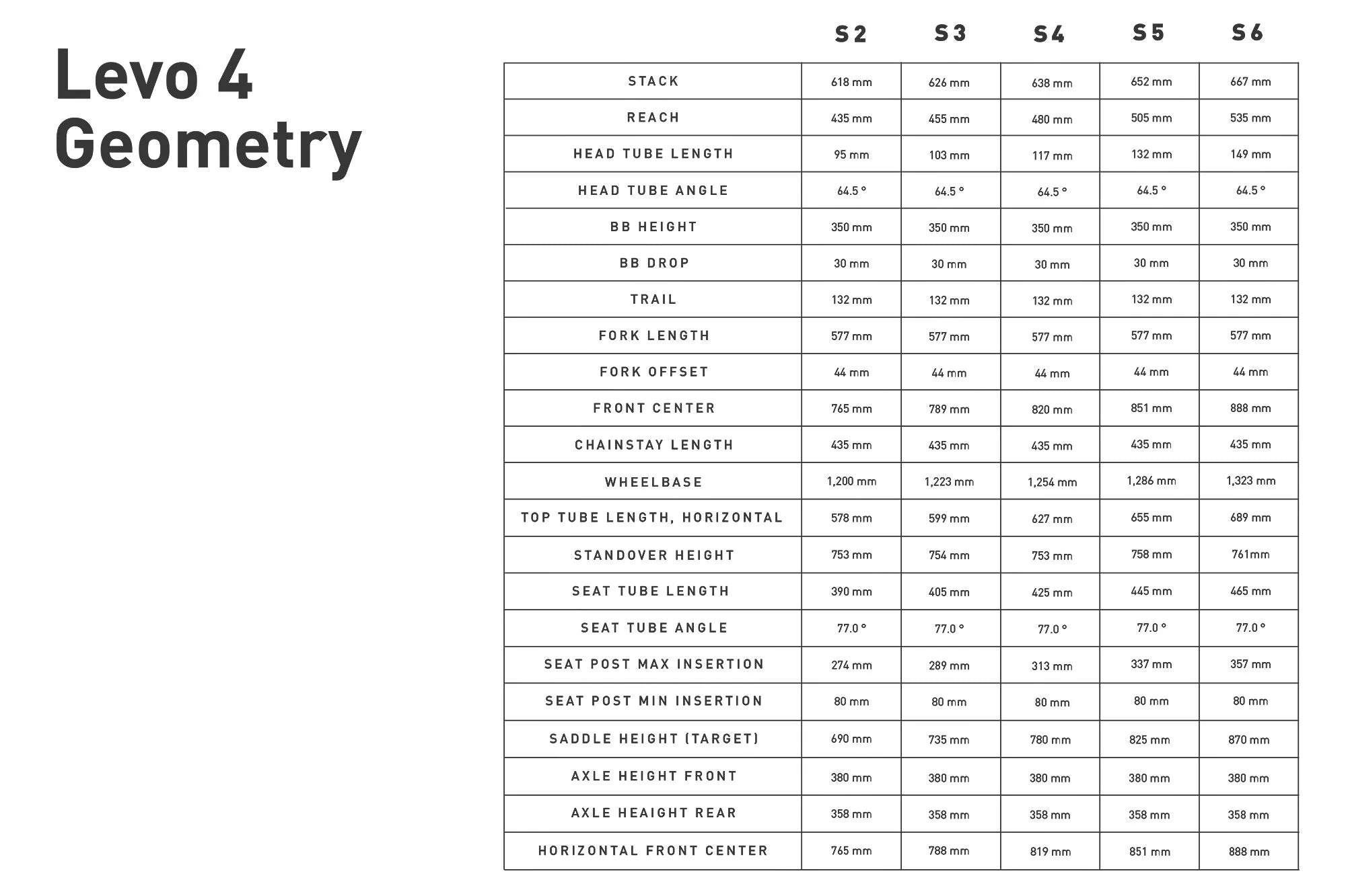All new Levo 4 frame, FACT 11m carbon chassis and rear-end, 12x148mm dropouts, sealed cartridge bearing pivots, SRAM UDH compatible, w/ SWAT storage, 150mm of travel, side entry battery, fork travel up to 180mm