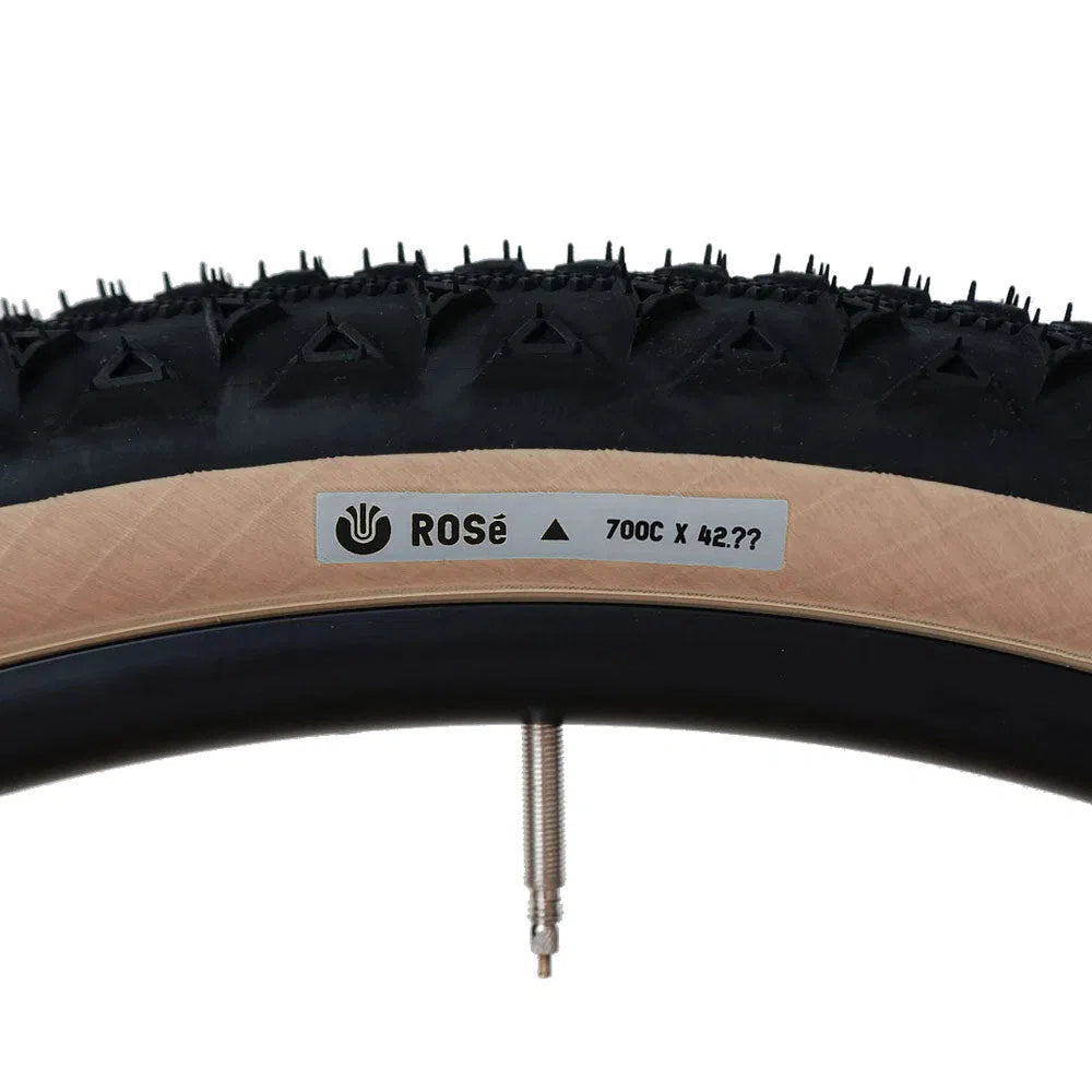 The ROSÉ tire is our flagship product, perfect for off-road traction and corner drifting. JFF (Just For Fun) tires are versatile for all types of riding, from long days in the pain dungeon to leisurely Sunday tours. Features include a carbon compound for extended tread life, durable casing, zero sidewall protection for a smooth ride, exotic file undertread, tubeless compatibility, continuous center tread, and a delta knob pattern for superior braking traction. Sold individually in sizes 650b x 47.99mm and 700c x 42.??, with weights of 515g and 485g. Experience the luxury of JFF tires for all your cycling adventures.