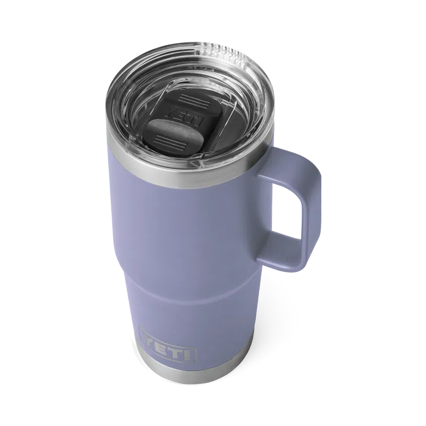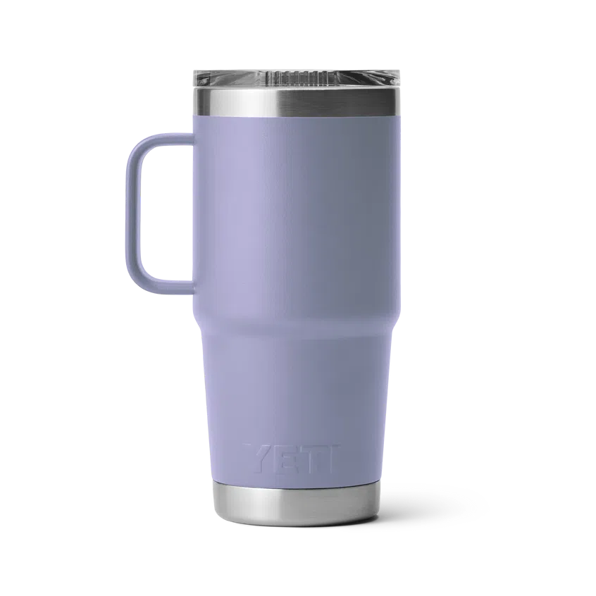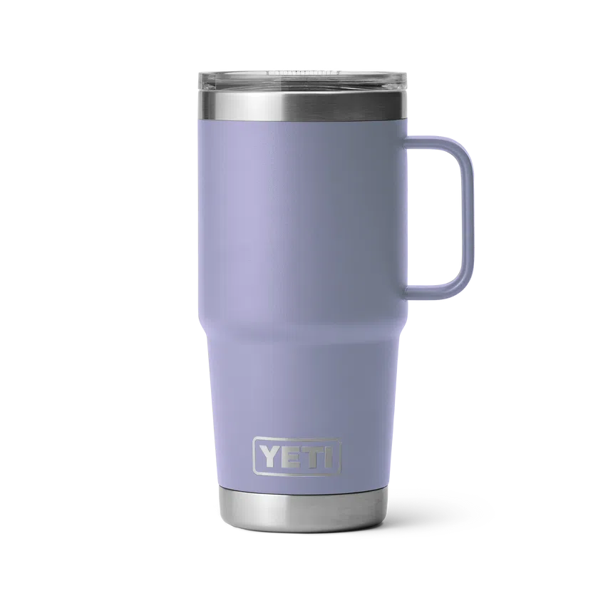 Introducing the YETI Rambler 20 OZ Travel Mug, a stylish and functional solution for keeping your beverages hot or cold on the go. This insulated stainless steel mug features a Keeper Lid for easy one-handed sipping and a No Sweat Design to keep your hands dry. The triple-grip handle makes it convenient to carry, and the cosmic lilac colour adds a touch of style to your daily routine.